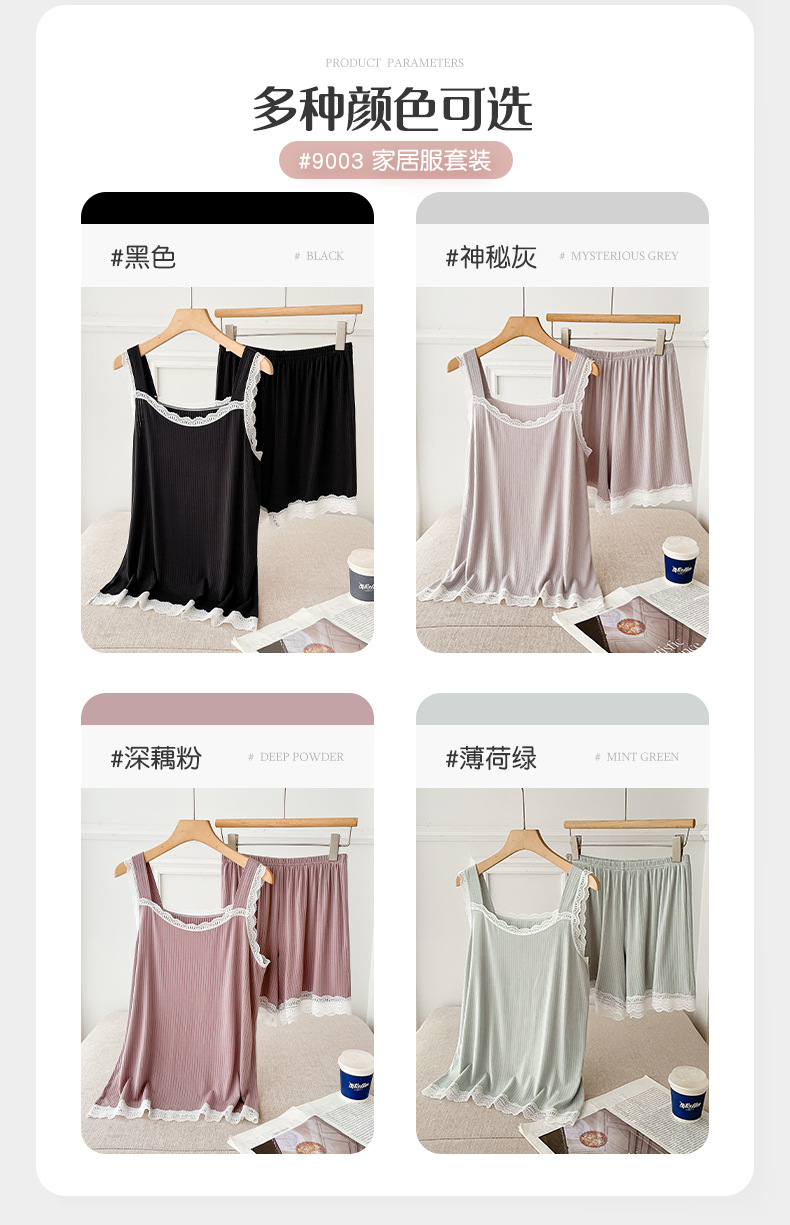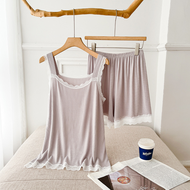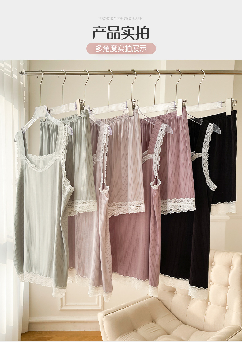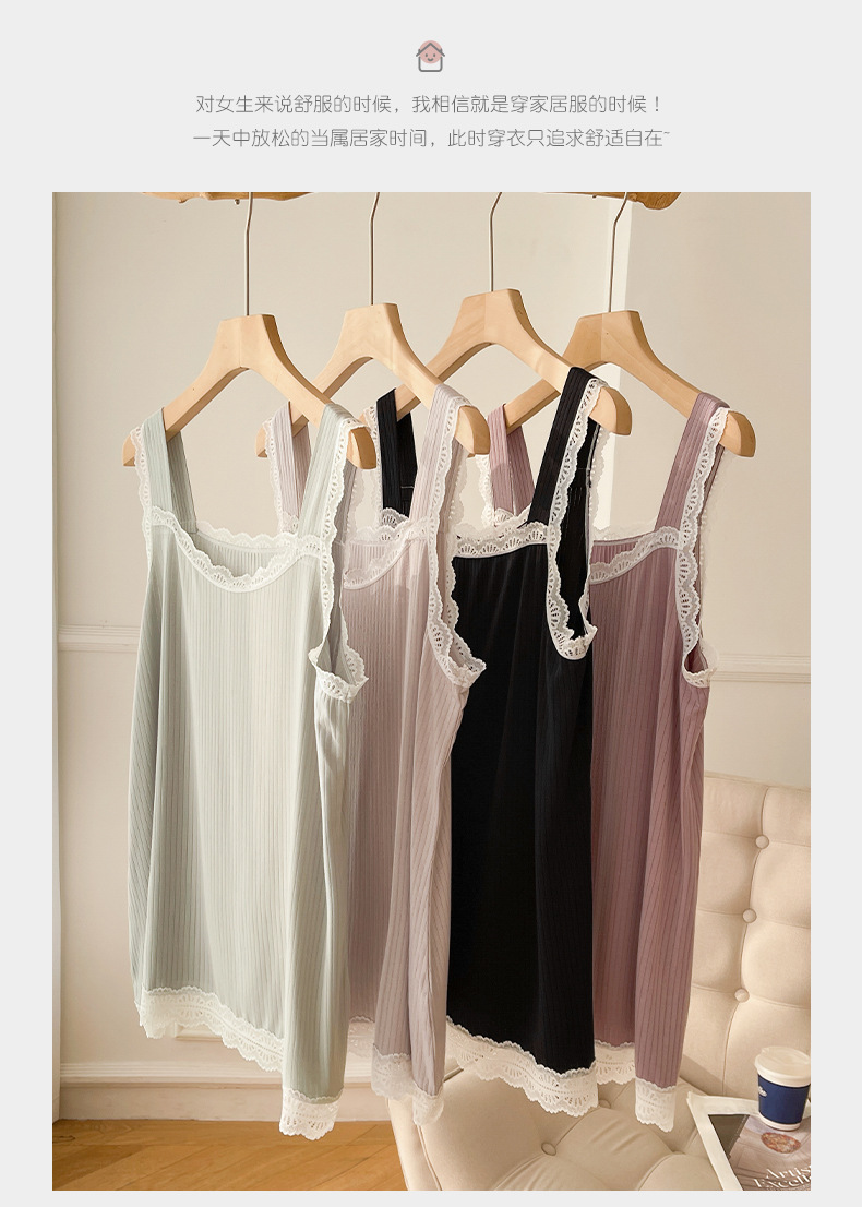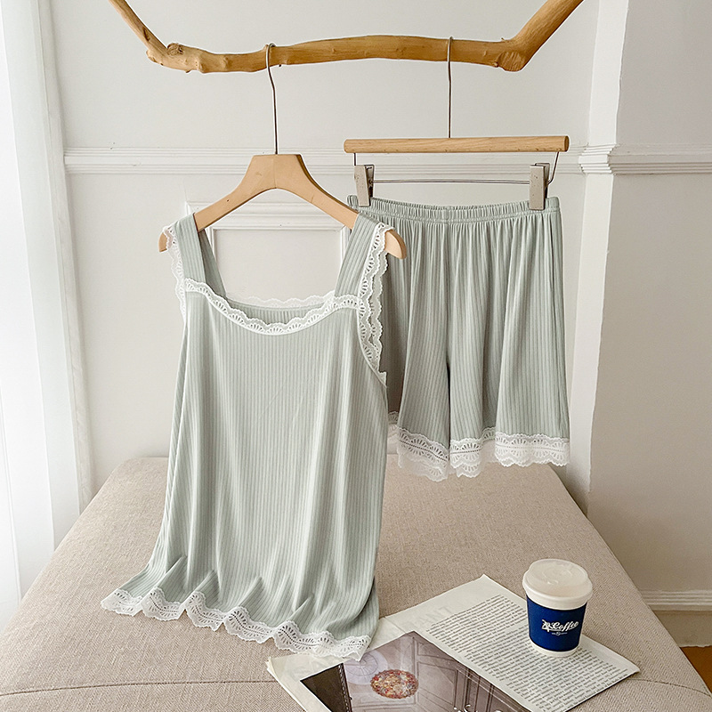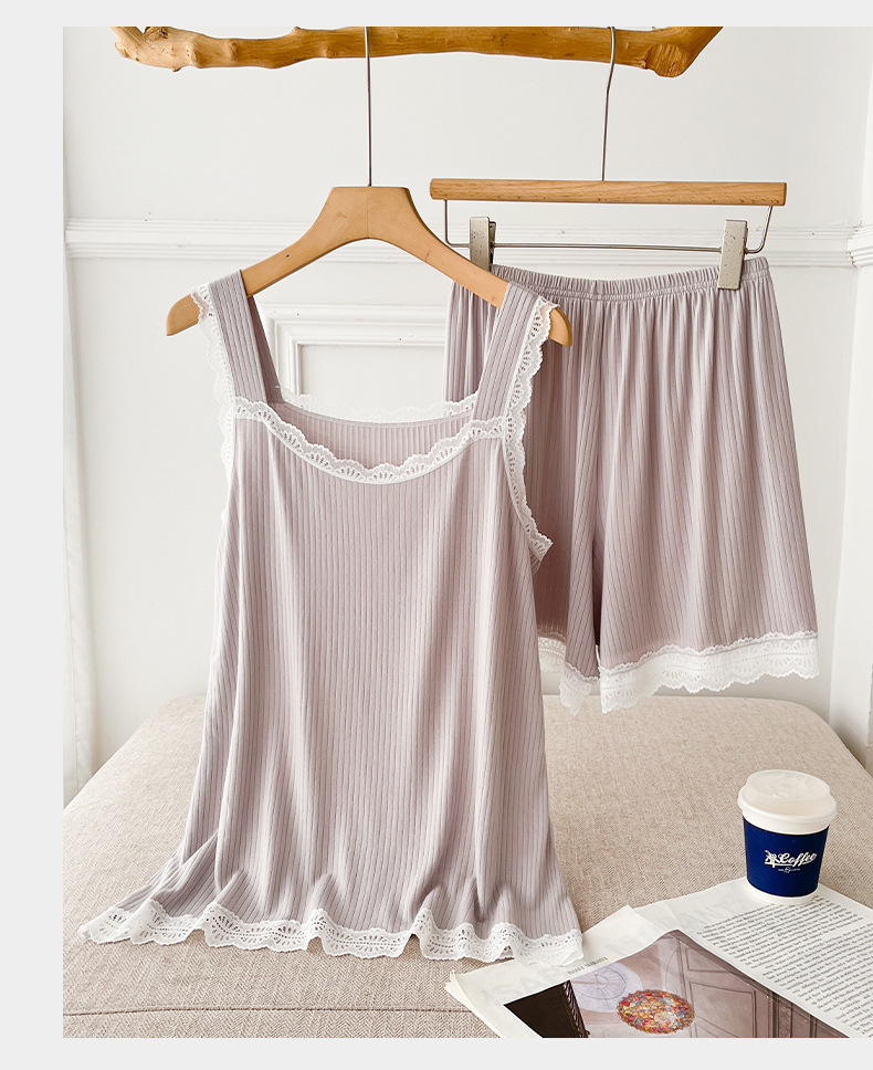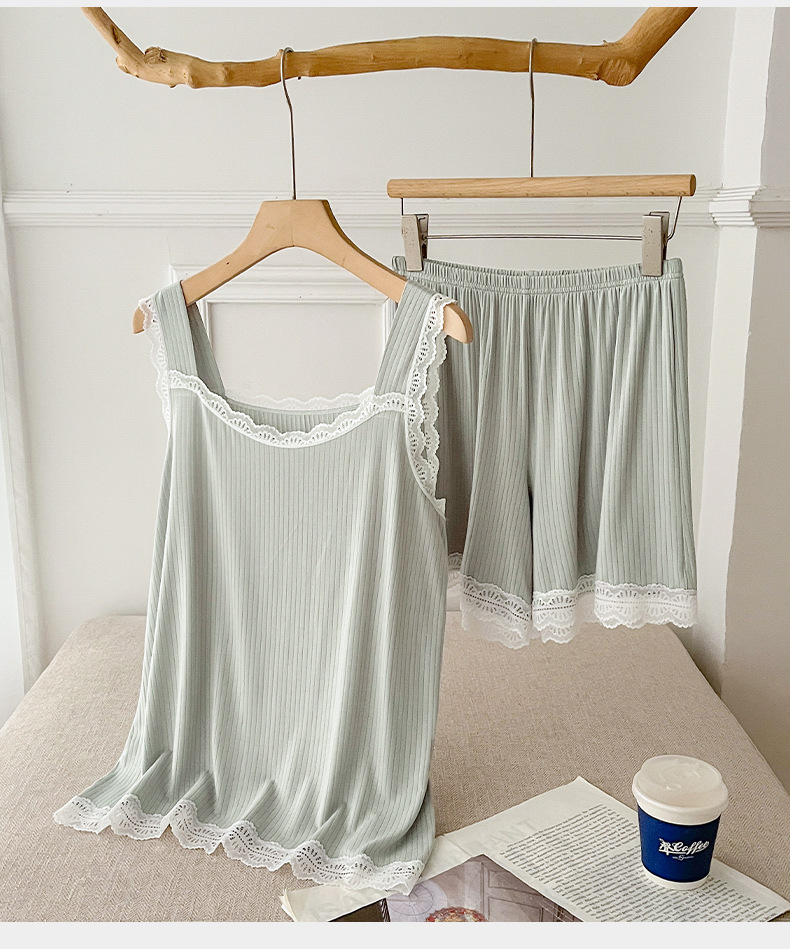 lace covered round neck wide shoulder strap vest shorts pajamas women loose cool home wear suit women can wear outside 中文版