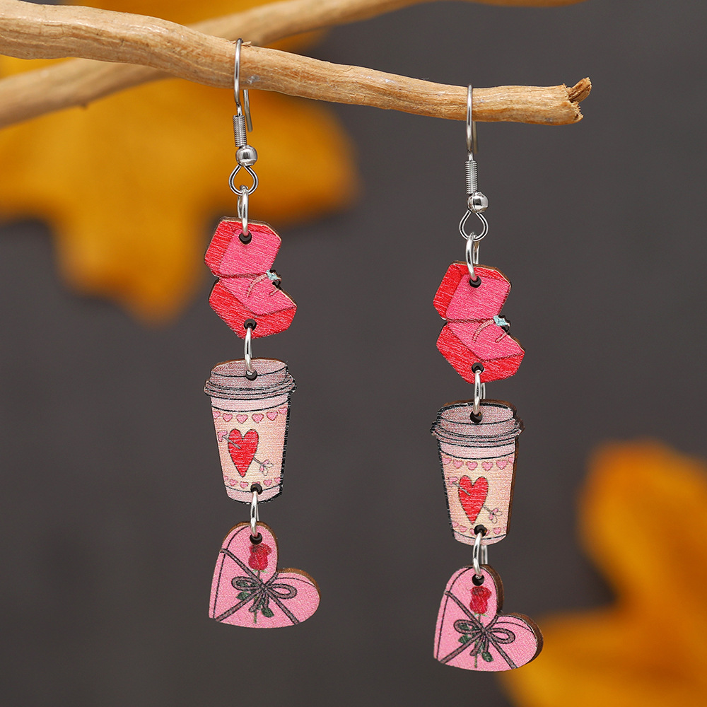 european and american personalized creative heart gift box water cup printing ear hook wooden earrings amazon hot valentine's day earrings 中文版