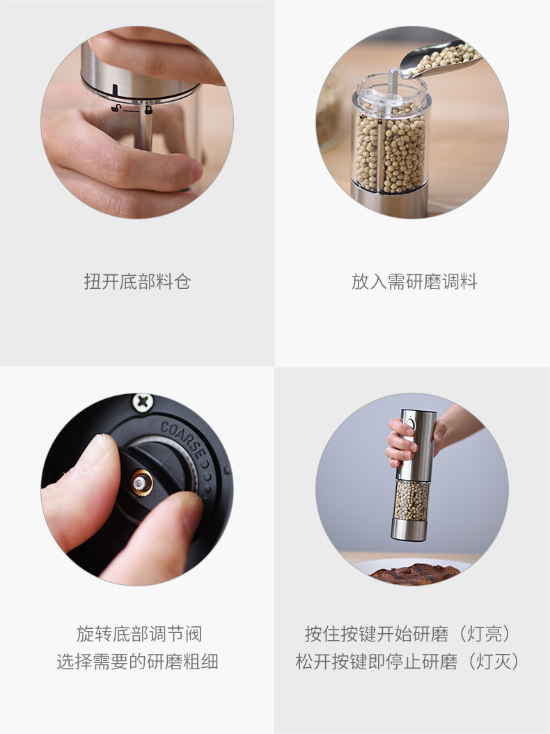 An electric pepper grinder requires a battery that can deliver a momentary discharge of 3-4A. Alkaline batteries are considered power-type batteries and can meet the momentary discharge requirement. It is recommended to purchase equivalent quality batteries from brands such as Nanfu or Duracell to ensure smooth opening of the bottle.