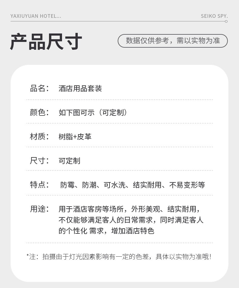 two:Hotel room supplies (hotel leather goods products, hotel acrylic products, mini-fridge, safe, hair dryer, electric kettle, towel basket, trash bin)