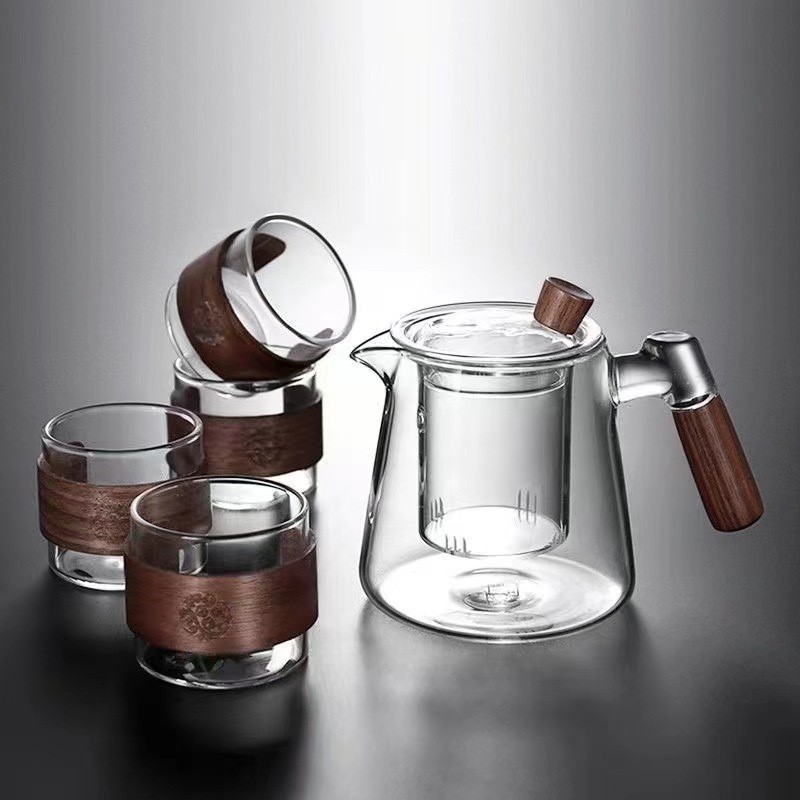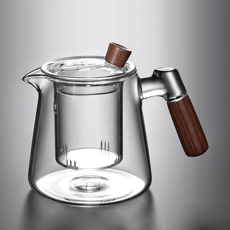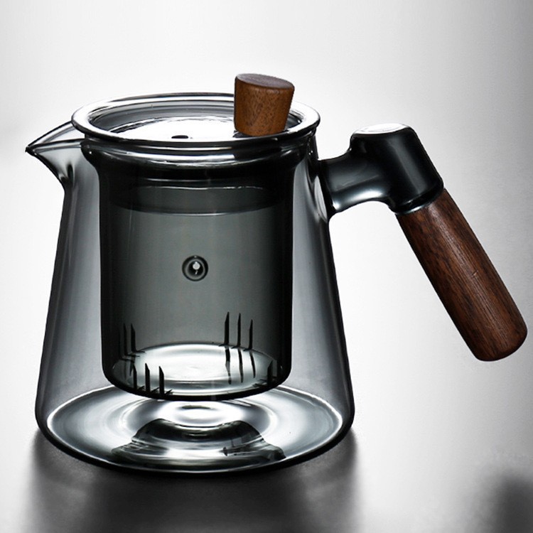 in stock borosilicate smoky gray teapot side wooden handle glass tea set household teapot suit leaky teapot three-piece set 中文版