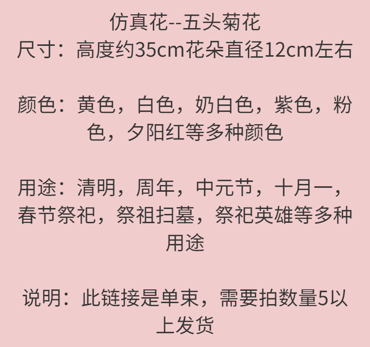 | five heads miss chrysanthemum upgraded version 20 pieces (color mix and match) | ¥40.42 | 999999 piece available |