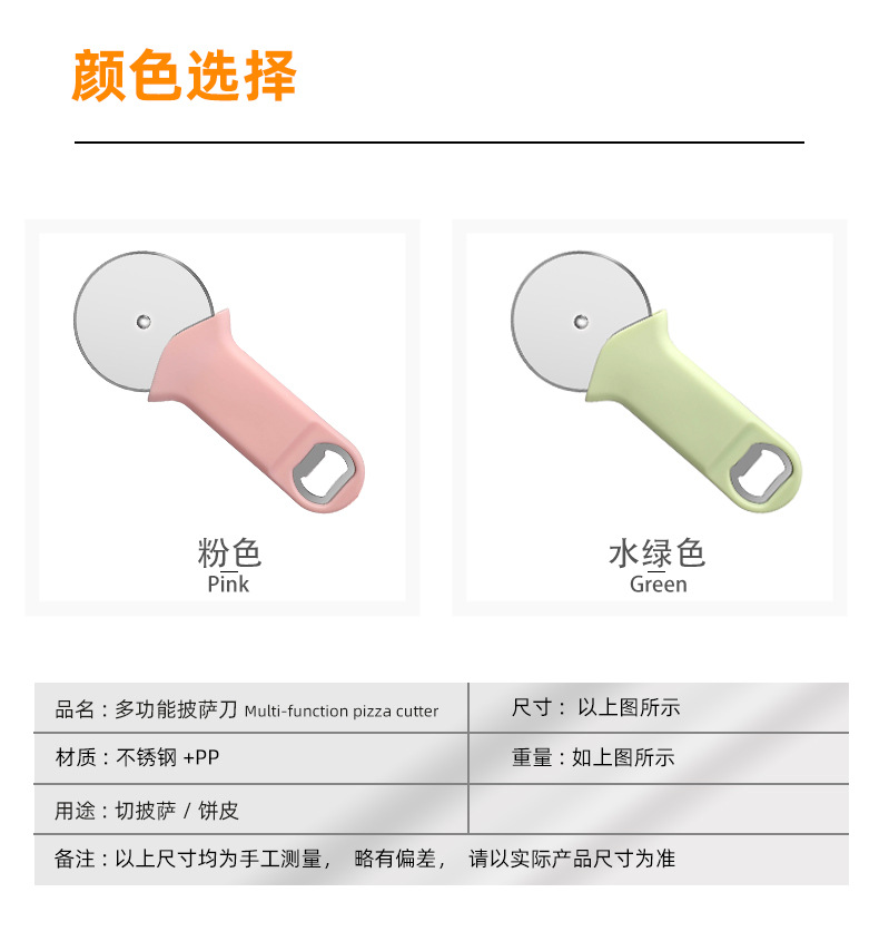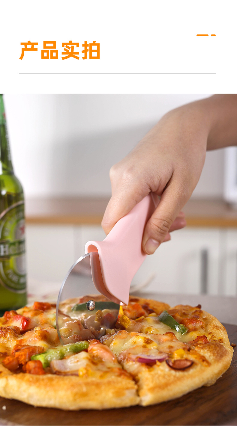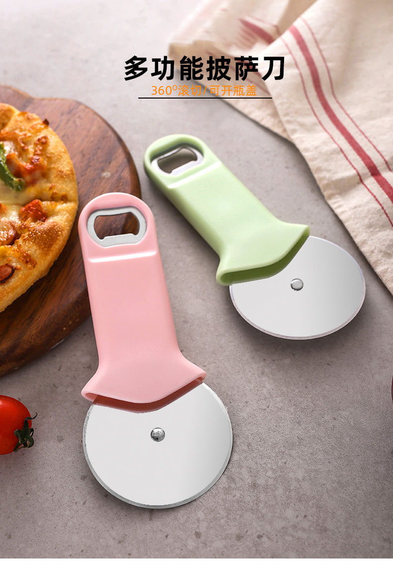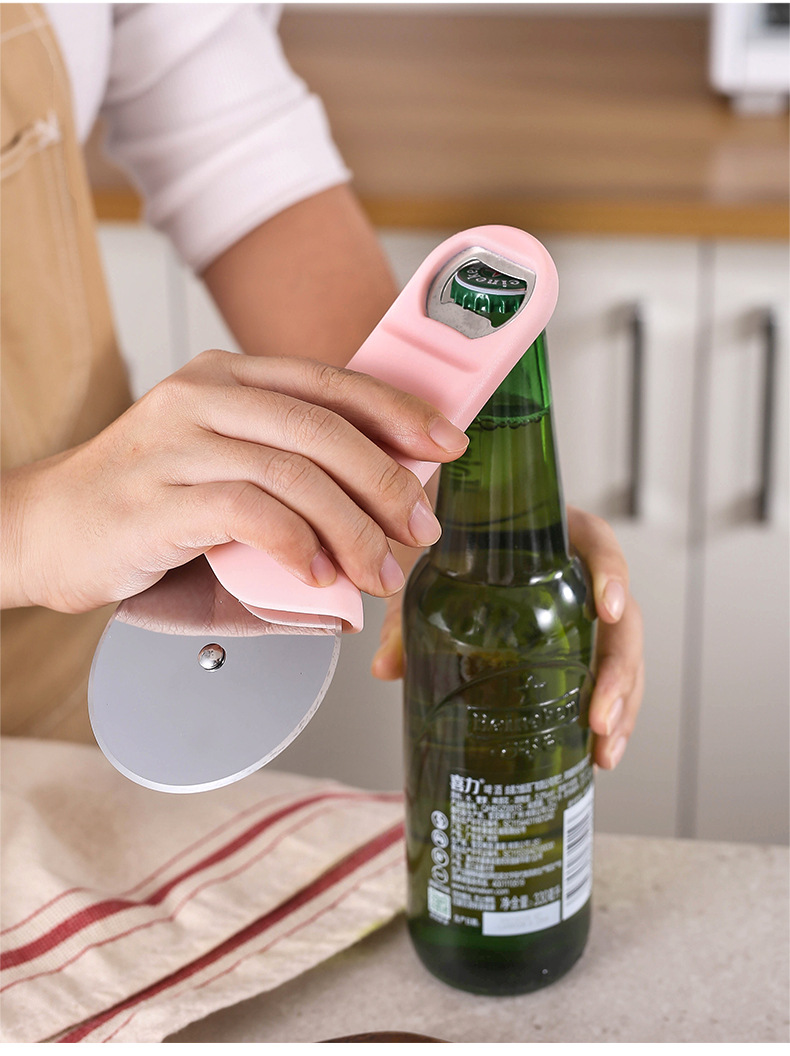 pink cap-opening and pizza-cutting dual-use pizza cutter