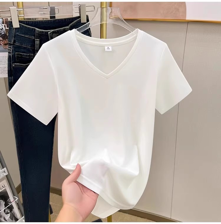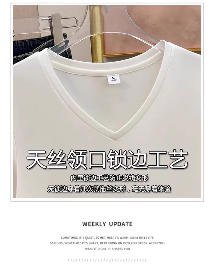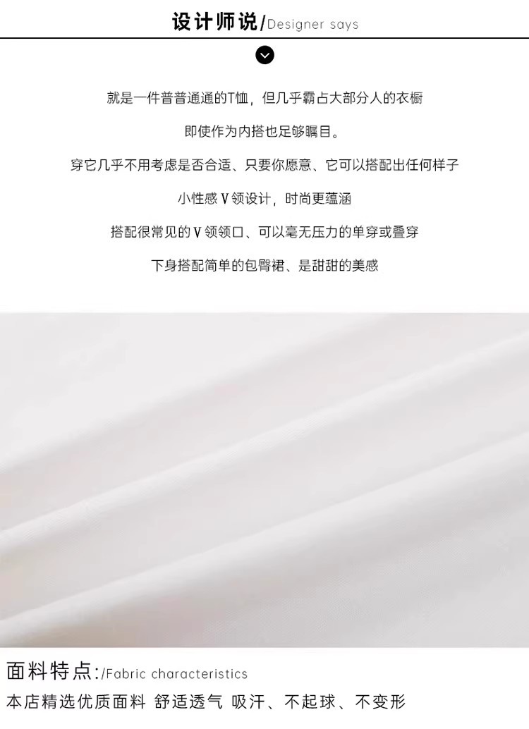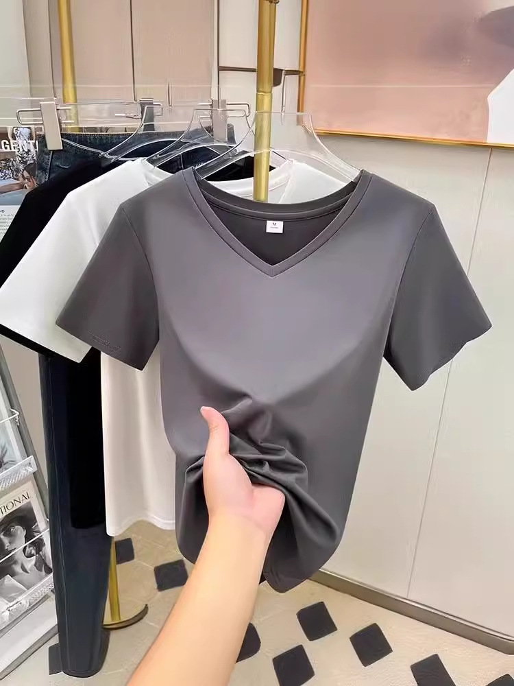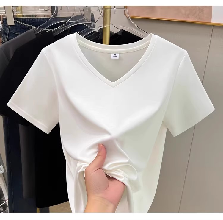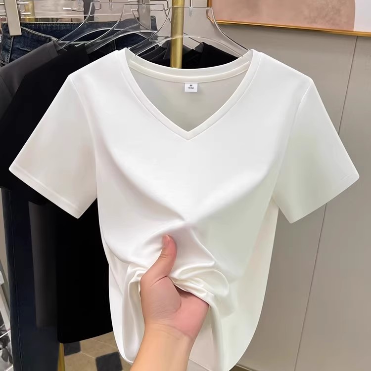 tencel high shoulder t-shirt women's summer new v-neck short-sleeved t-shirt loose niche design white bottoming shirt 中文版