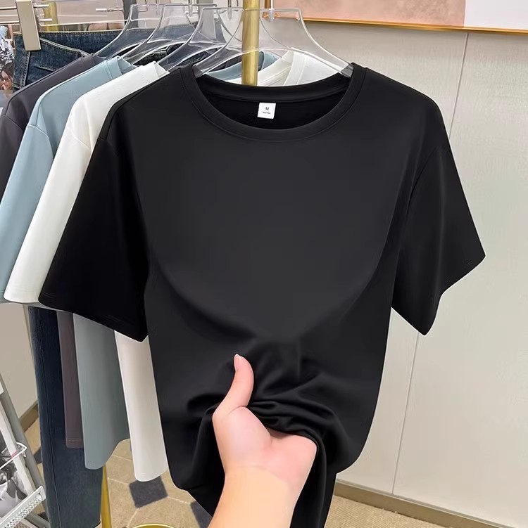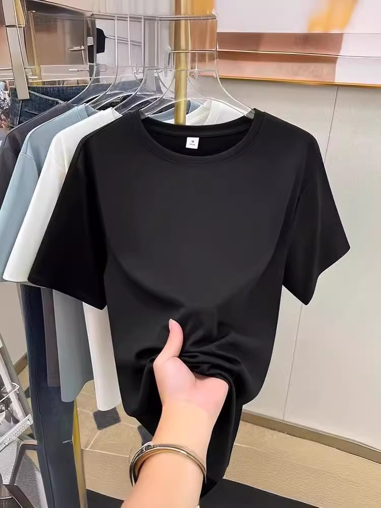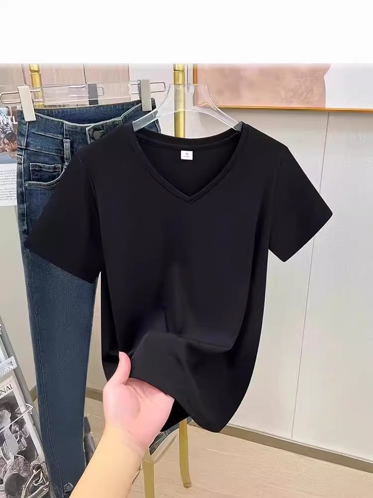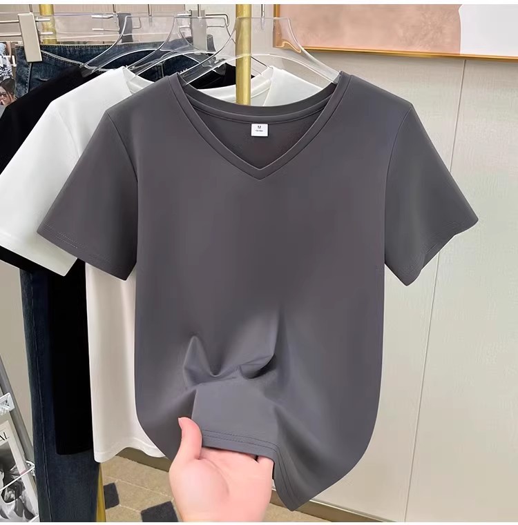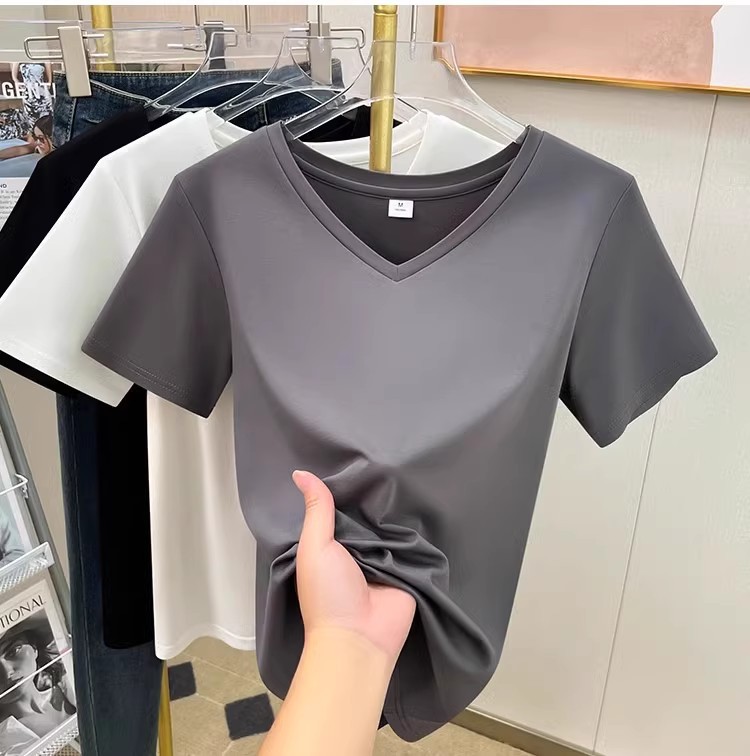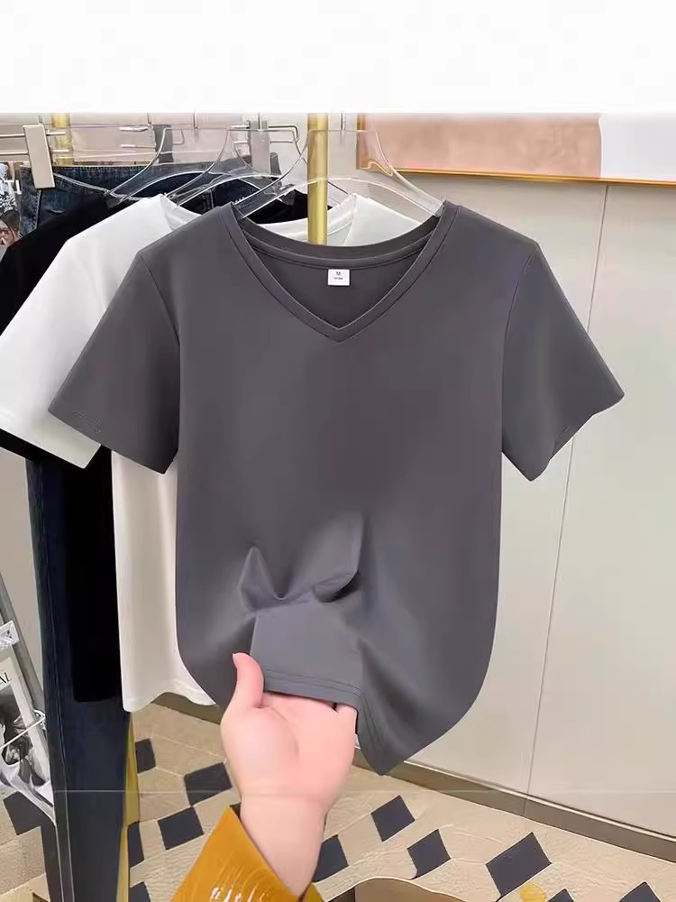tencel high shoulder t-shirt women's summer new v-neck short-sleeved t-shirt loose niche design white bottoming shirt 中文版