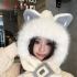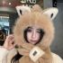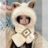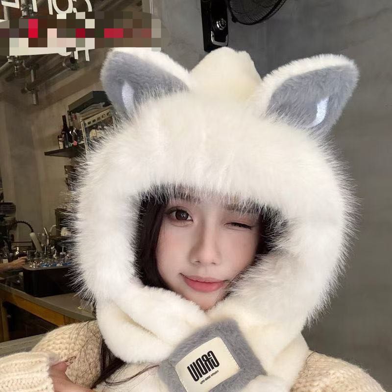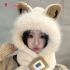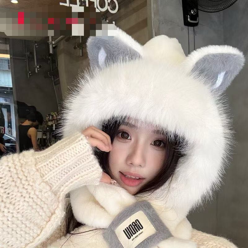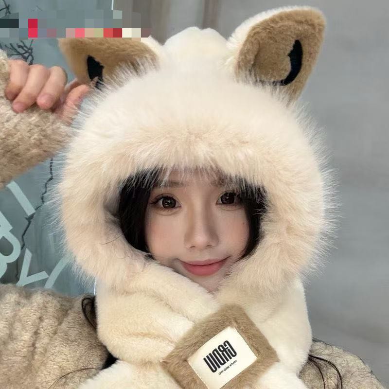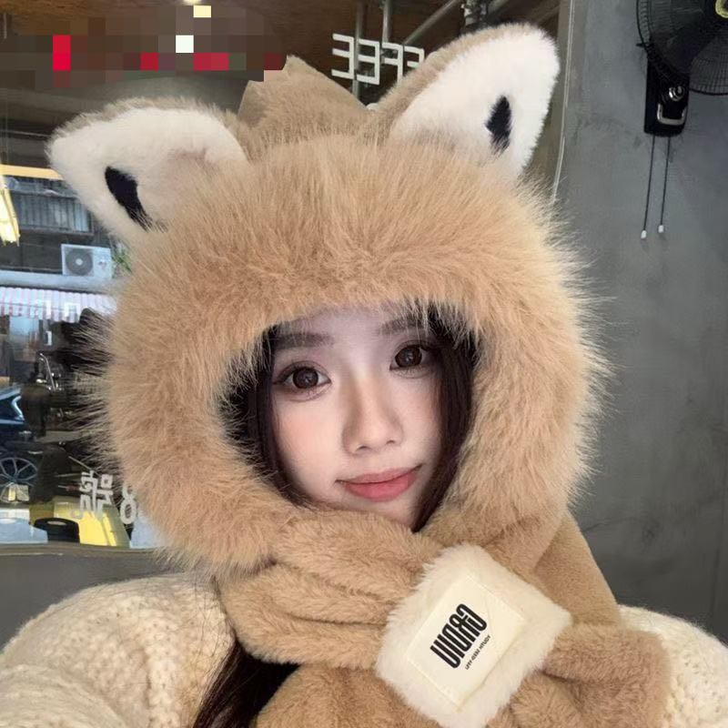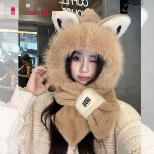 cute fox ears plush hat scarf integrated winter new fleece lined padded warm keeping cycling scarf ear protection 中文版