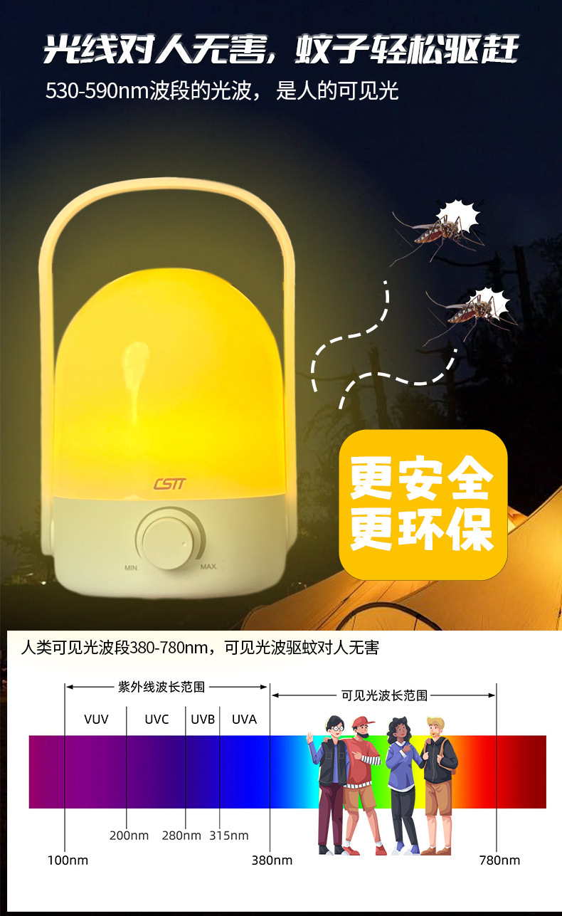 This product has two color sources for one light, white light and yellow light. The yellow light is a special wavelength of light that can repel mosquitoes, and it is a physical repelling method without any chemical components. There is no need to replace consumables, as long as the light can cover the area, it can repel mosquitoes.
