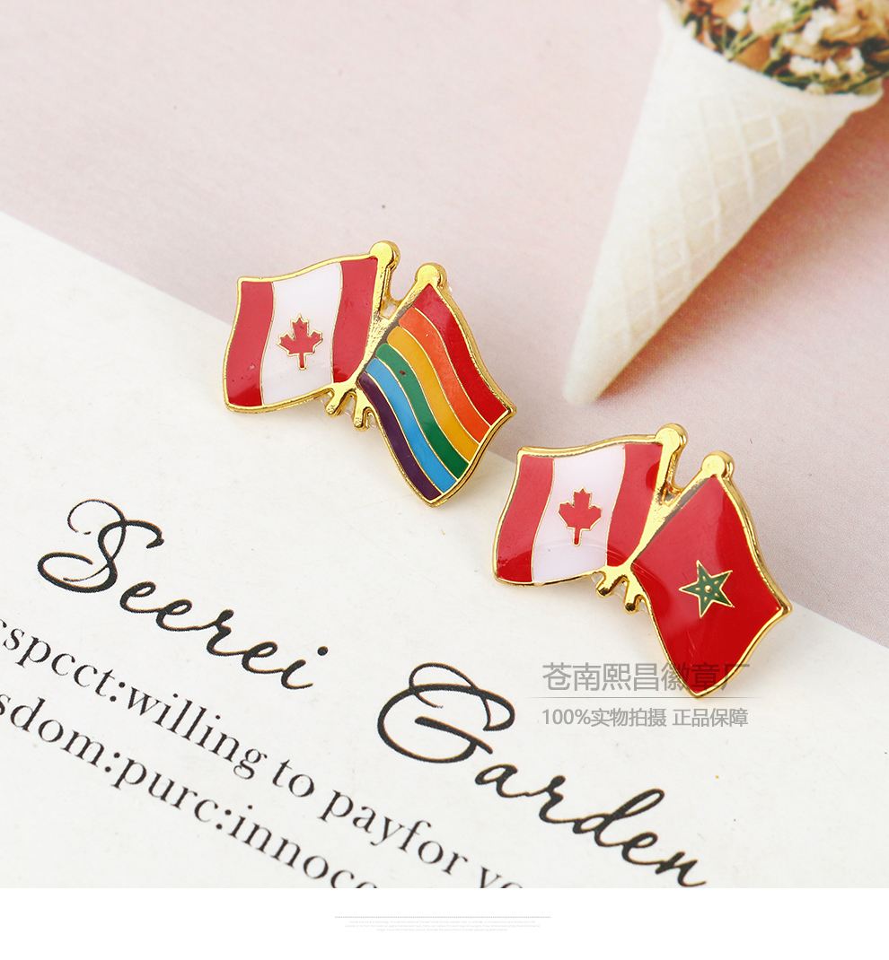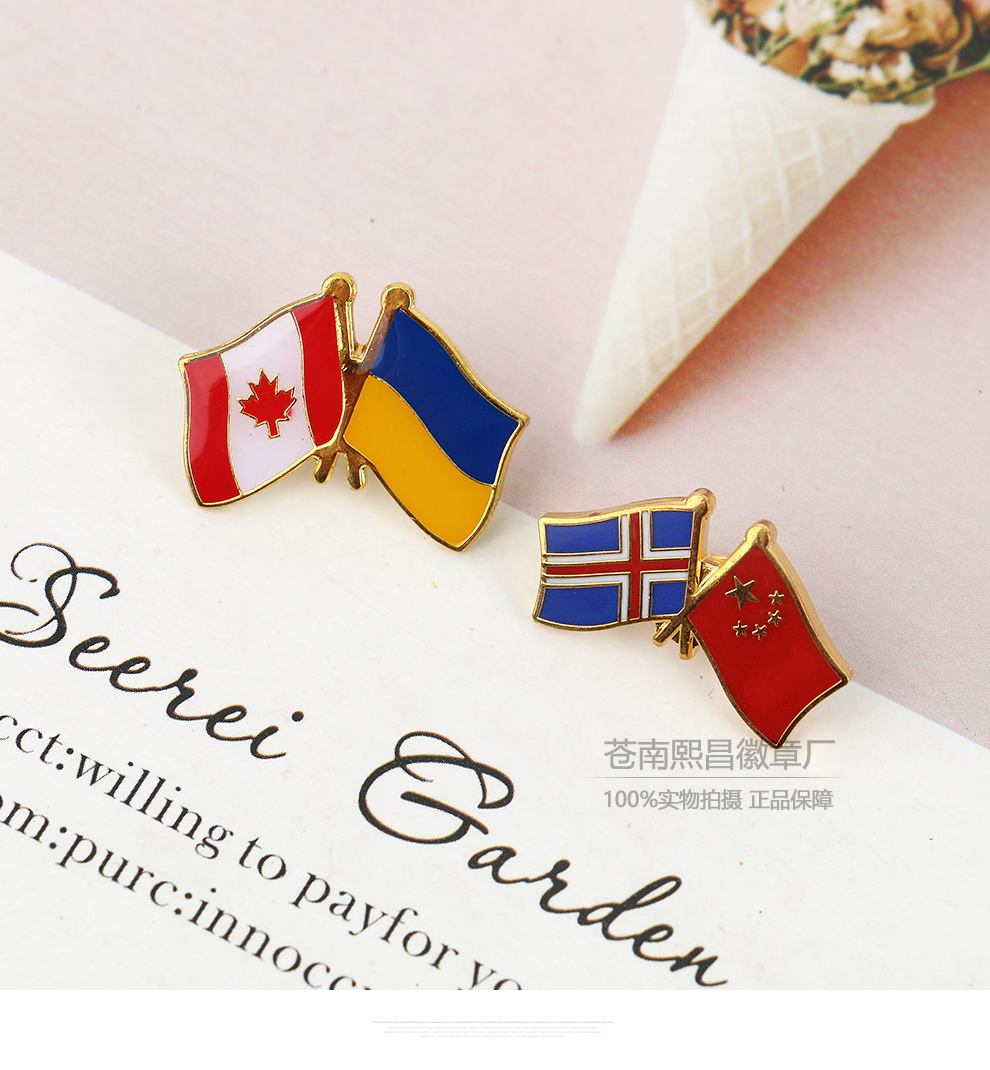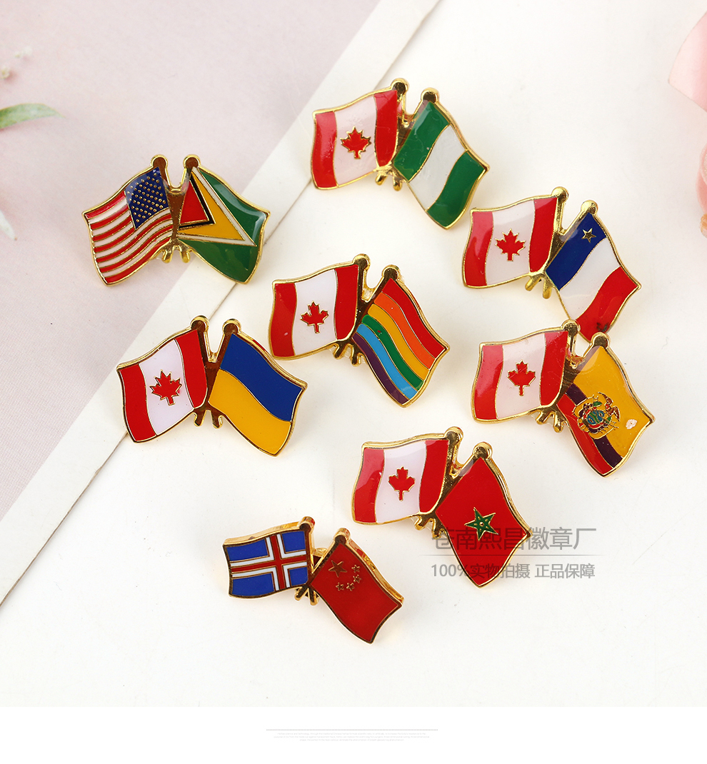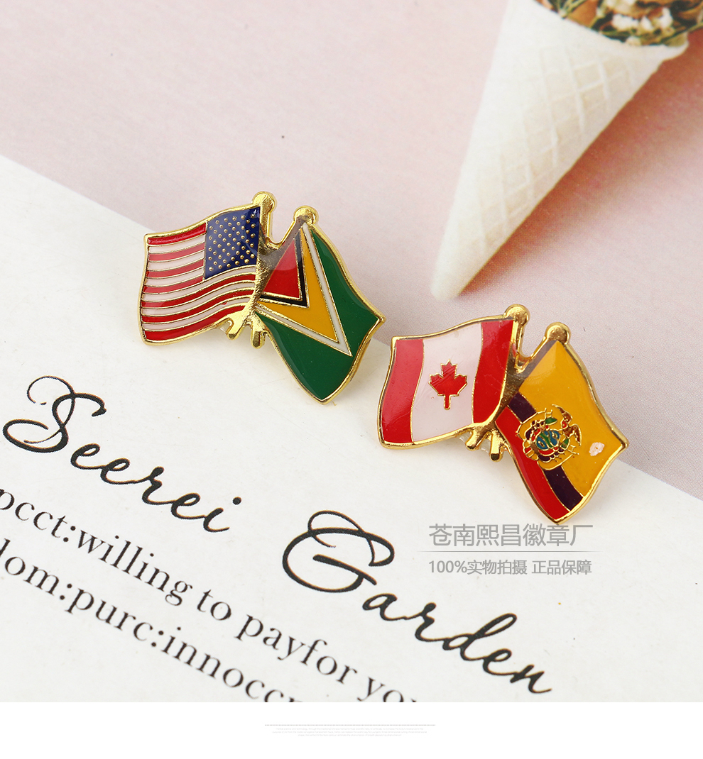 national friendly double flag golden m badge diplomatic hotel business exhibition cross double-sided flag brooch pin wholesale 中文版