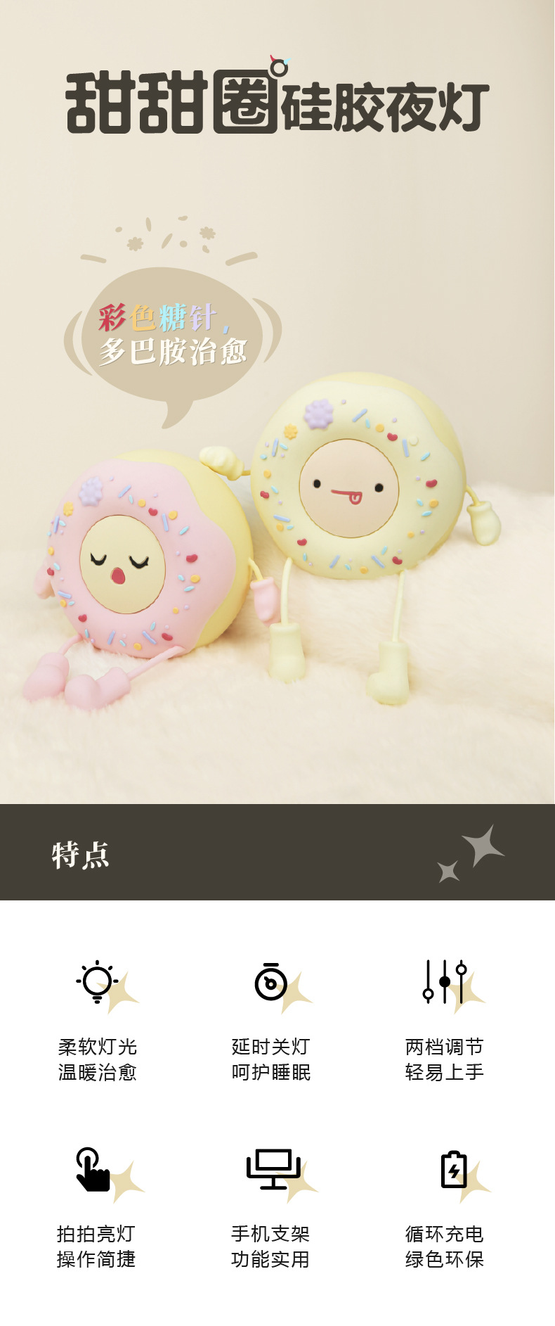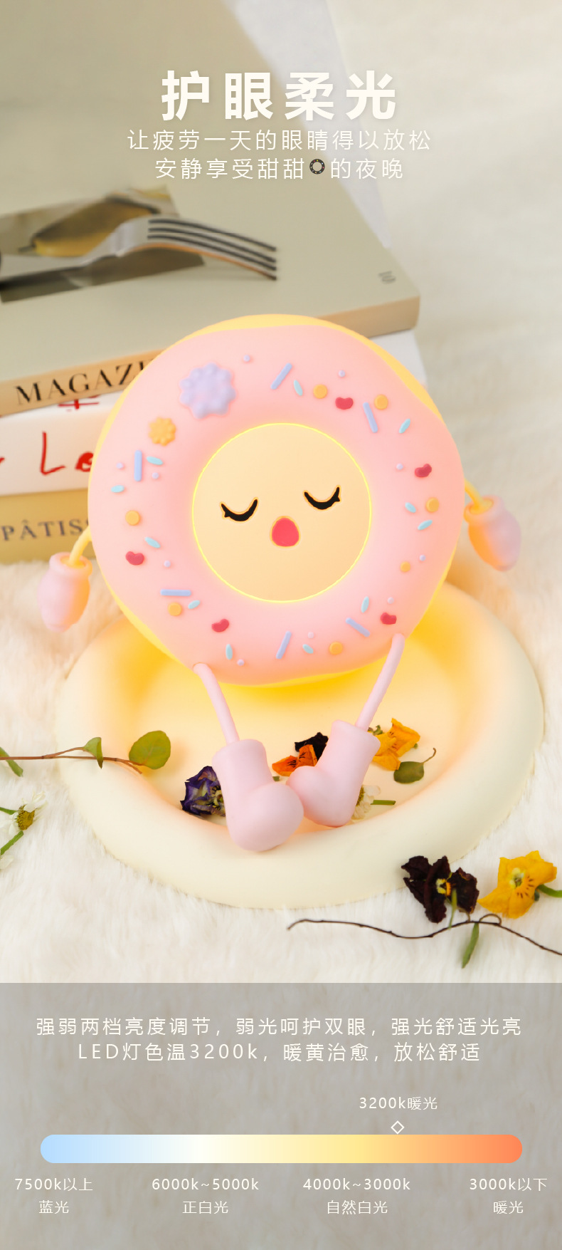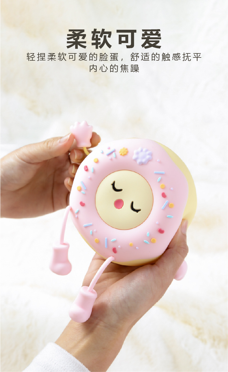 甜甜圈硅胶夜灯,用拟人的手法,还原甜甜圈多彩的糖霜,多彩带来的多巴胺舒适感,产品生动有趣。硅胶材质,细腻柔软,轻拍可以开关灯,调整亮度、便捷操作。内置20分钟倒计时关灯功能,晚上睡觉不用再手动关灯。