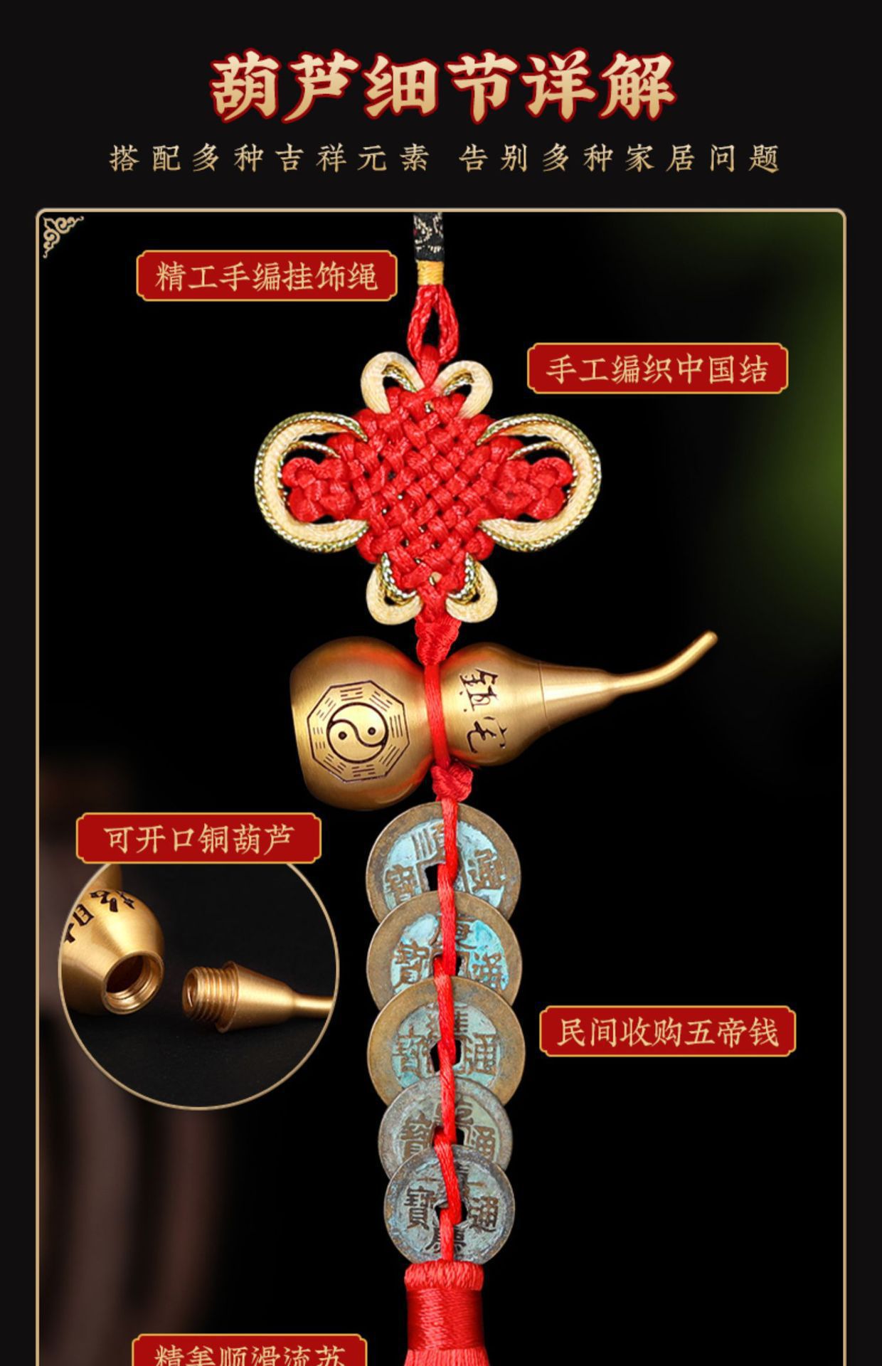 golden edge glossy gourd [3 big and 2 small] five emperor coins pendants