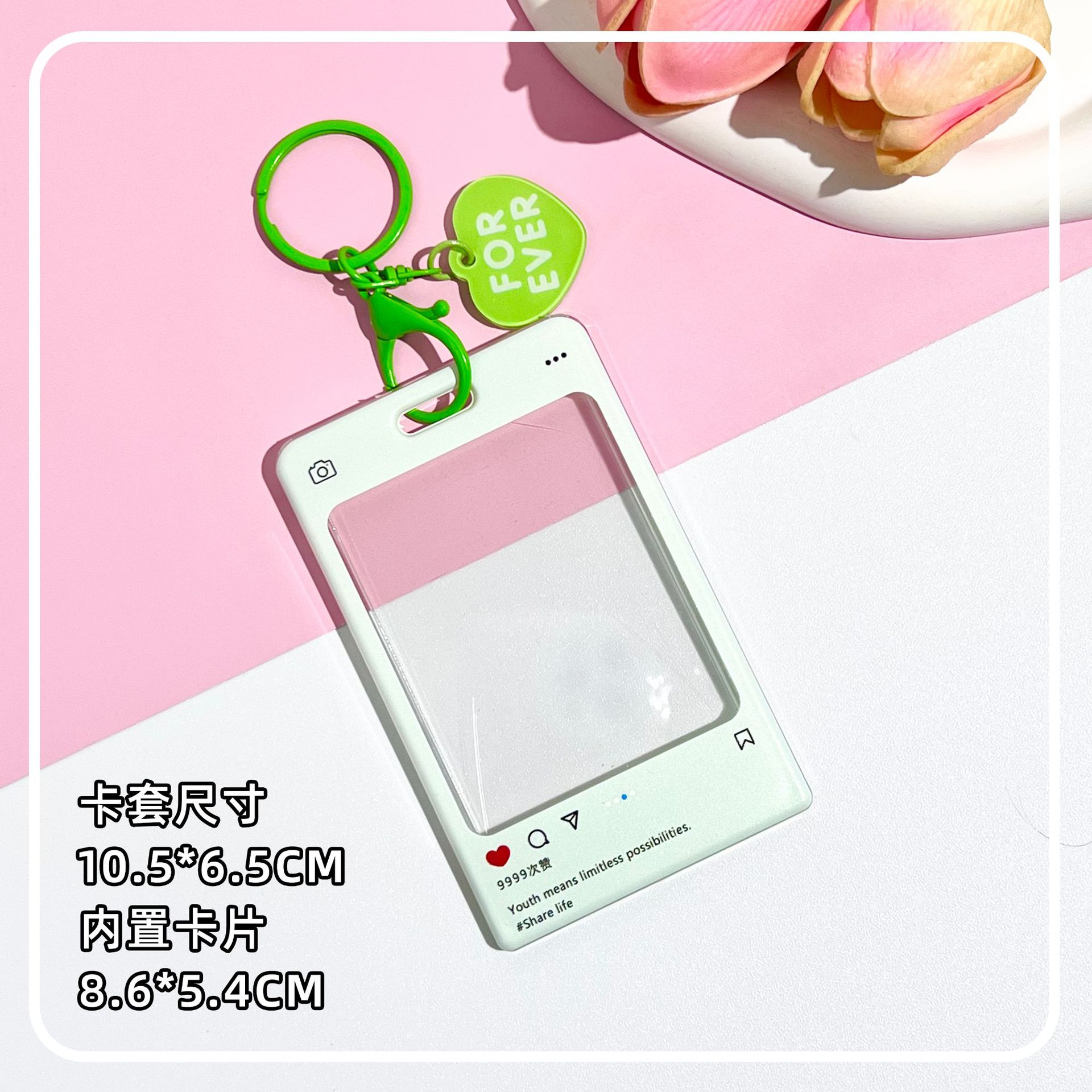 sliding cover transparent-green dialog box + white same color double circle spring rope (green chain + heart acrylic sheet)