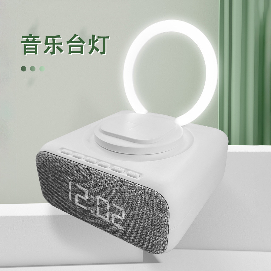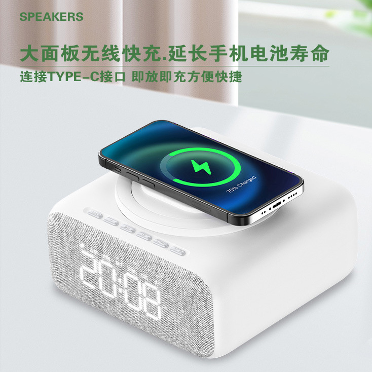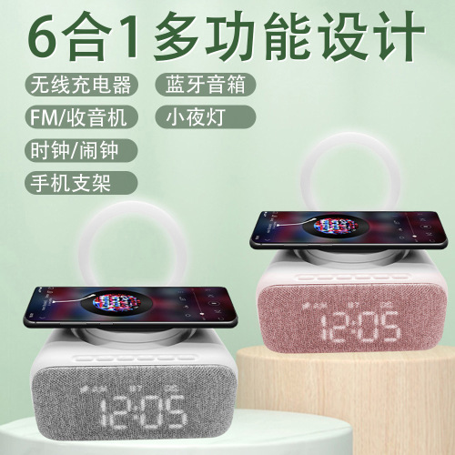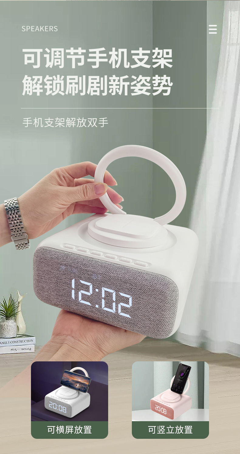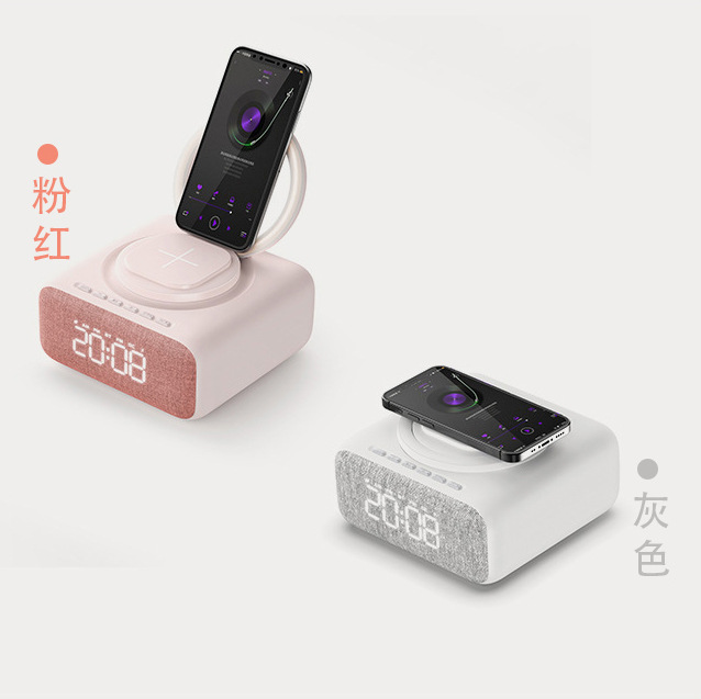 New export model mobile phone stand with 15W wireless charging, Bluetooth speaker, decorative item, multi-functional clock, alarm, night light, and audio system