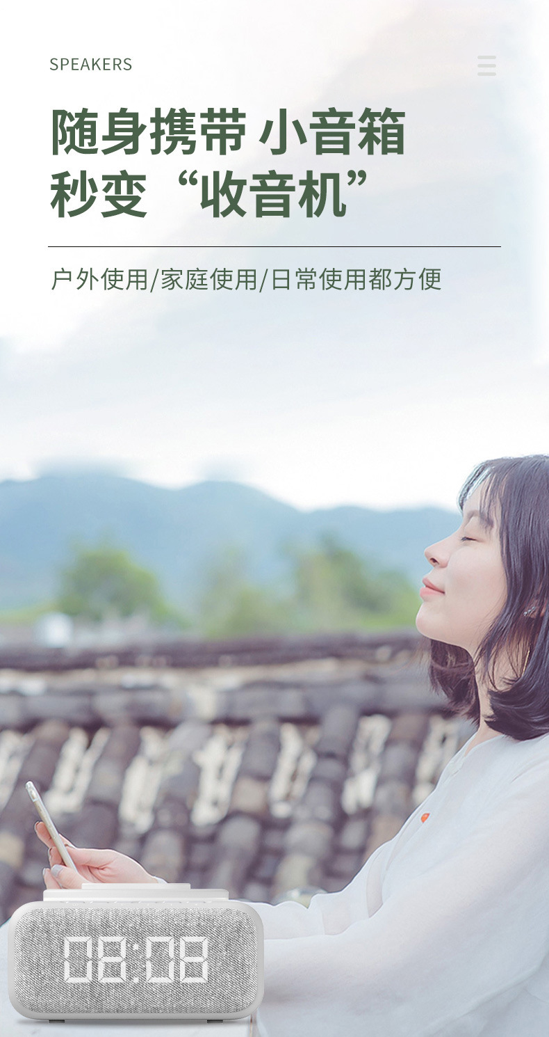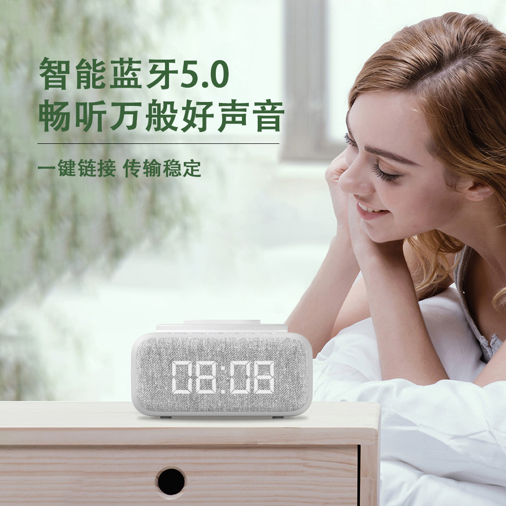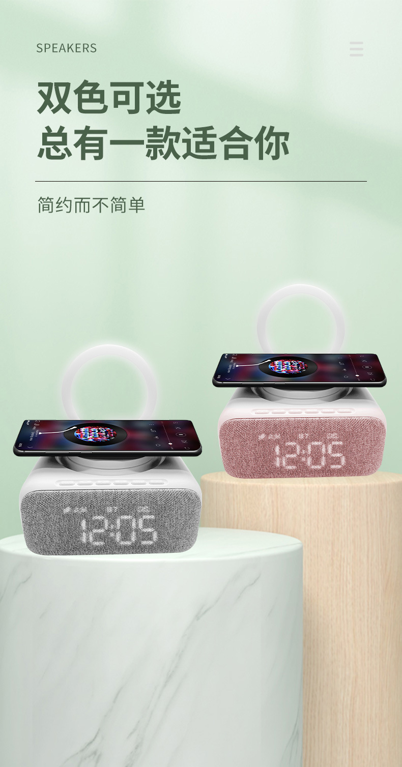 New export model mobile phone stand with 15W wireless charging, Bluetooth speaker, decorative item, multi-functional clock, alarm, night light, and audio system