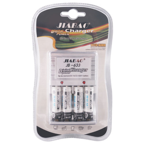 Export wholesale English version 4-slot charger and charging set (A633 + 4 AA 600mAh batteries), the charger comes with a plug (available in US/EU standards), supports charging AA/AAA/9V NiMH/NiCd batteries, the charging continues in red light status, and the full charge must be calculated.