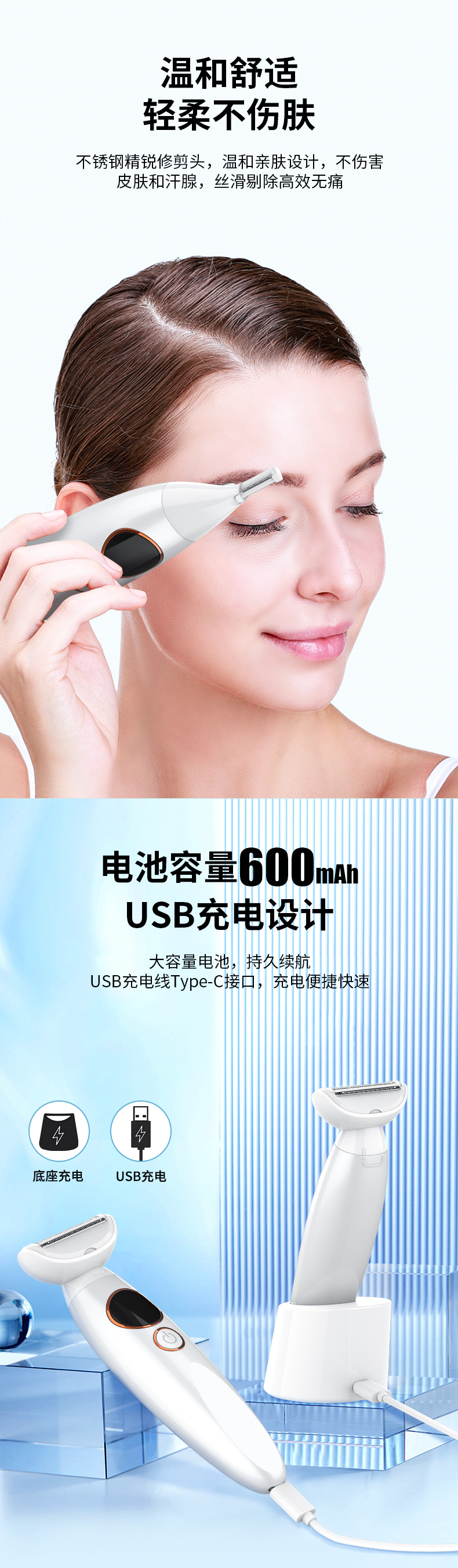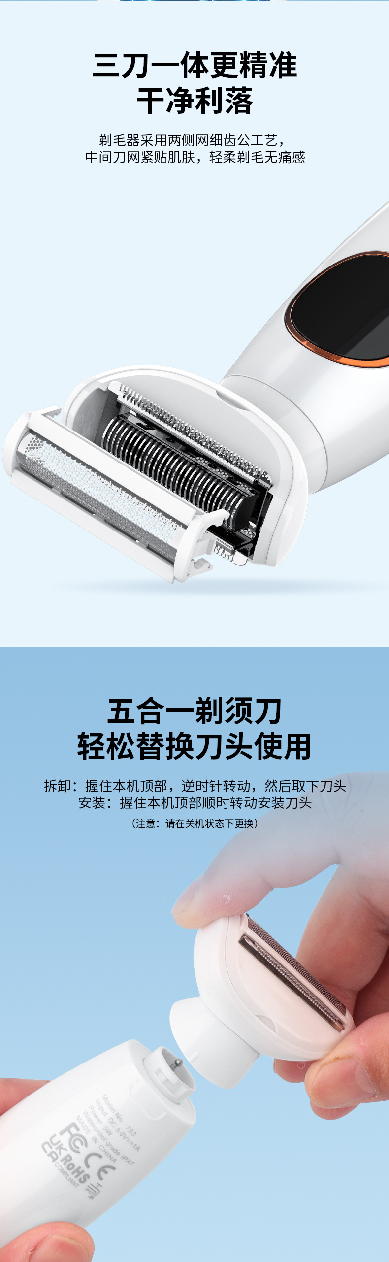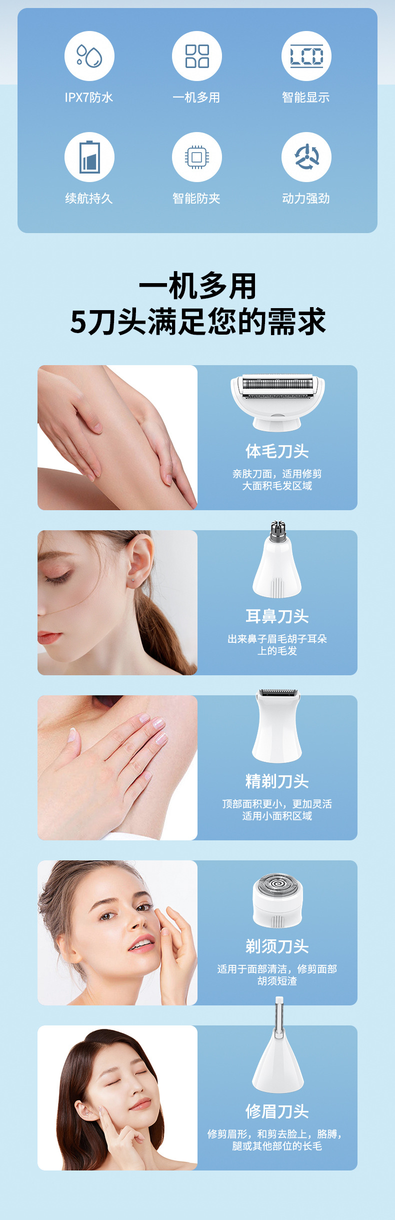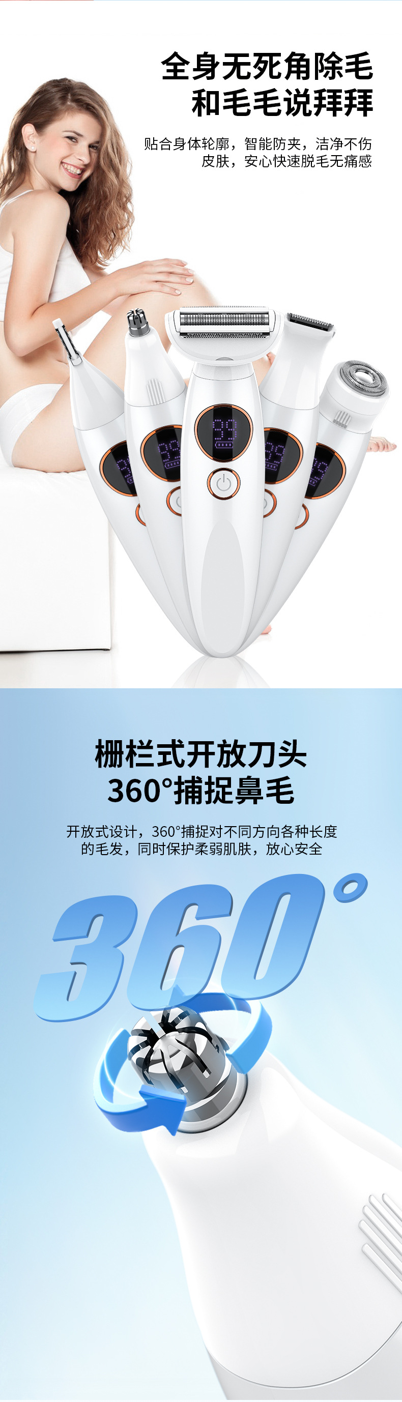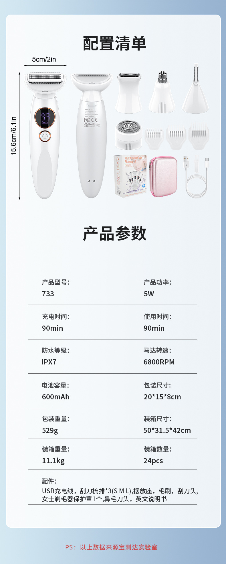accessories: body, shaving head, single mesh hair trimmer head, sideburns hair trimmer head, nose hair trimming cutter head, eye-brow knife head, positioning comb * 3, usb charging cable, cleaning brush, eva storage bag