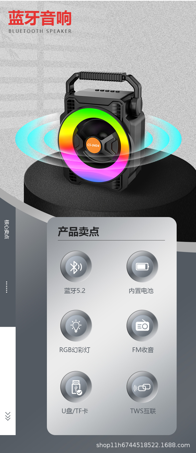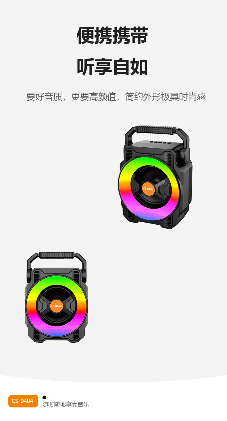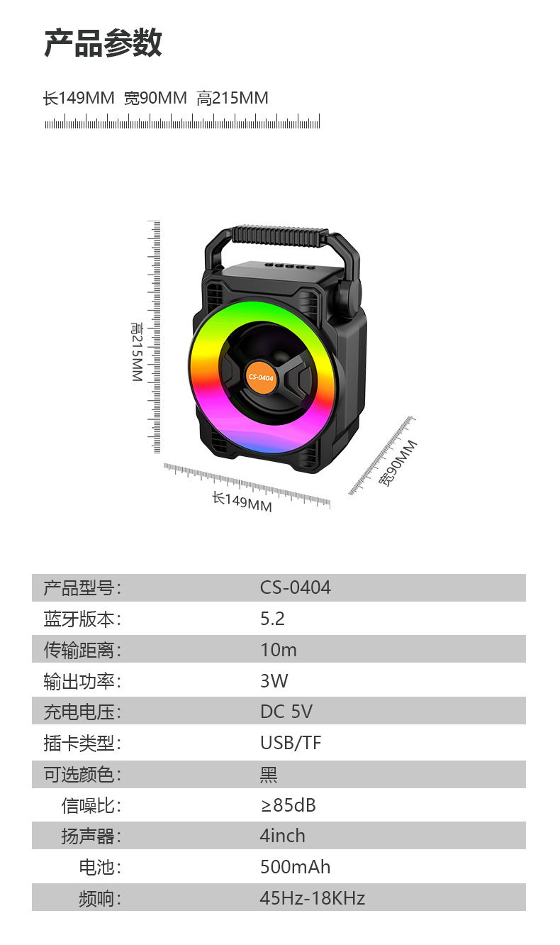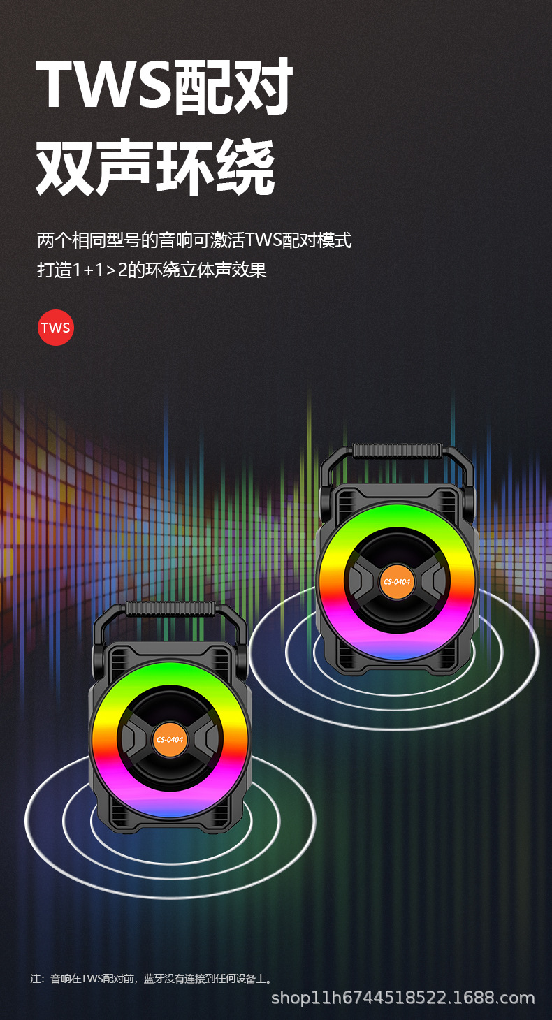 TF, USB, FM, Bluetooth function, TWS pairing function, multi-color lighting, 5 buttons