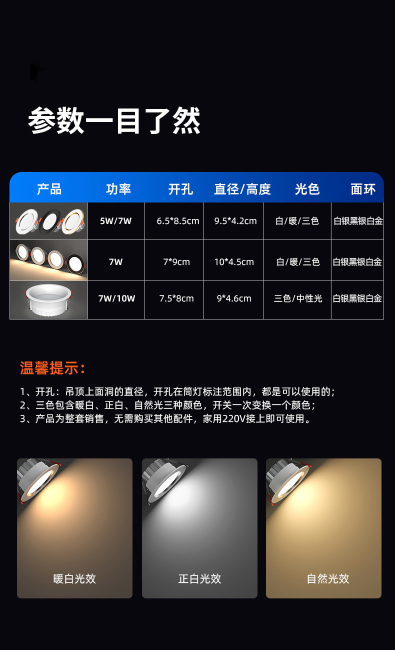 platinum 7w three-color [luxury all aluminum] hole 6.5-9cm