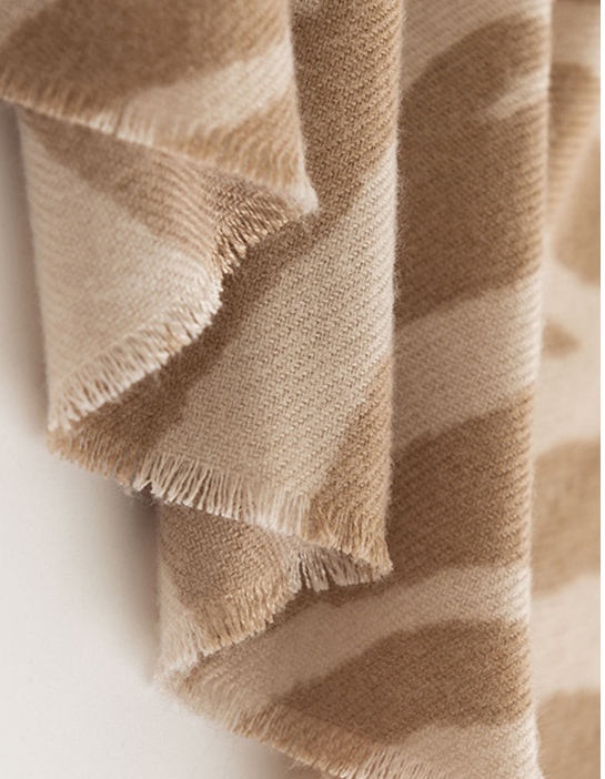 Imitation cashmere print with scattered whiskers, zebra pattern, size: 65*190, weight: 195 grams, material: 80% polyester, 20% viscose, item number: 51149319