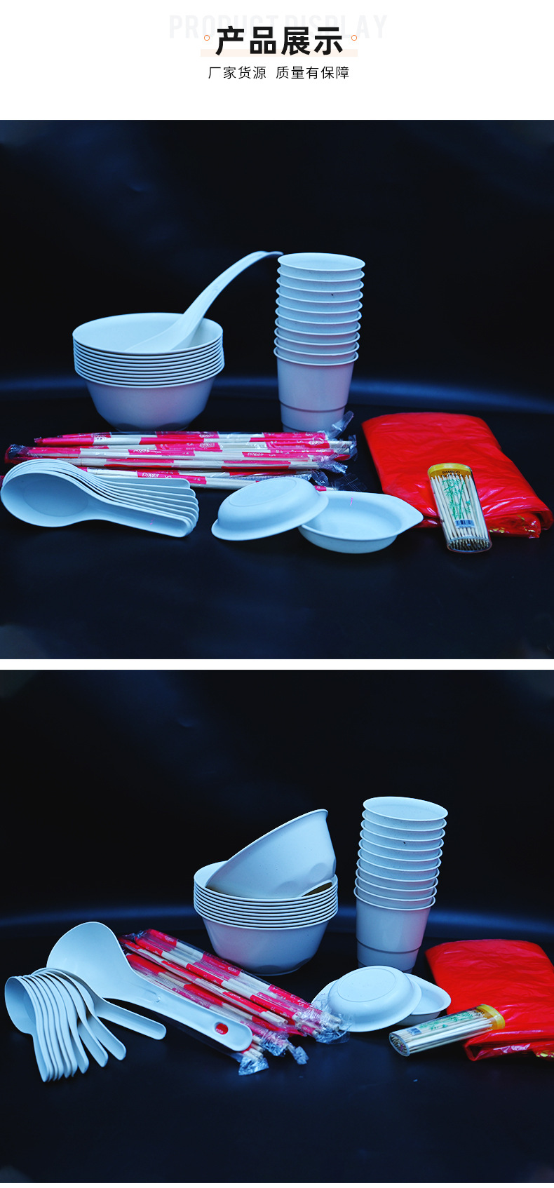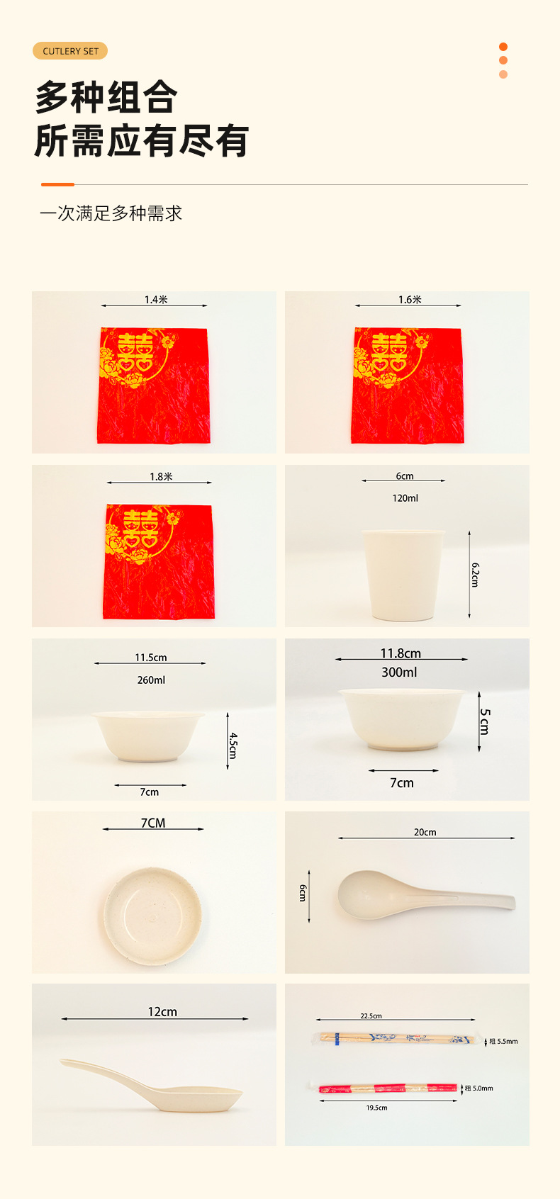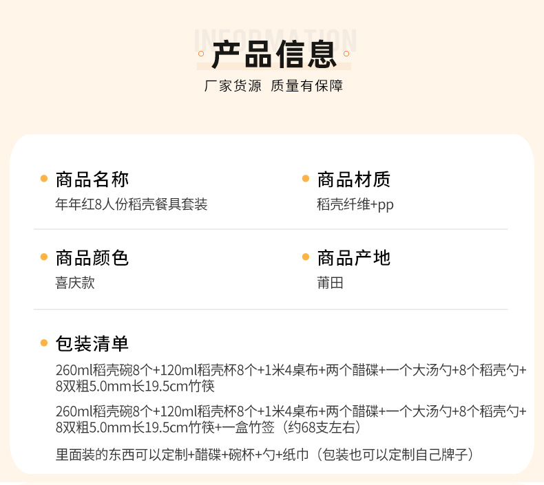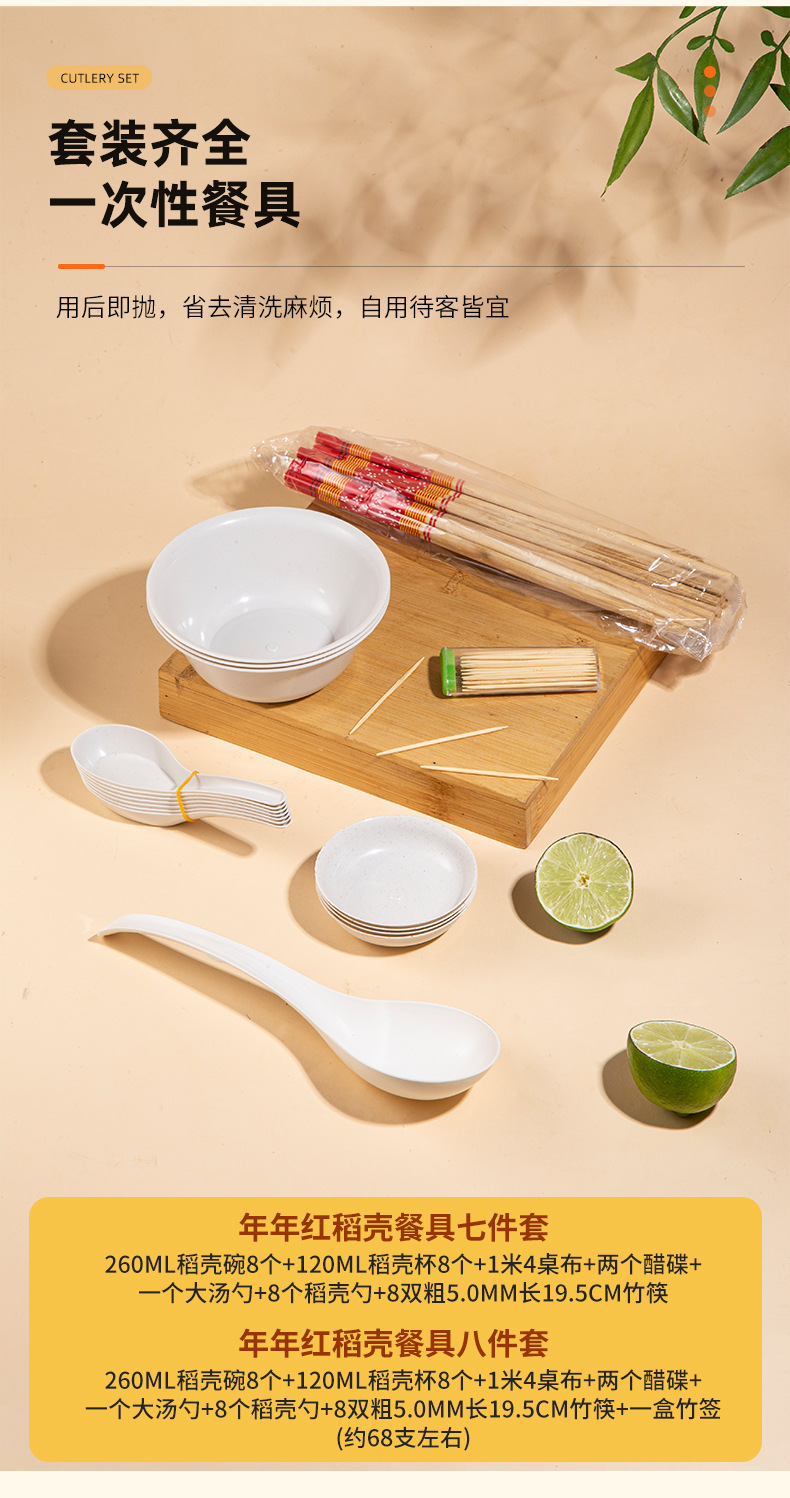 | 8-piece set (bowl + cup + bamboo chopsticks + spoon + spoon + vinegar dish + tablecloth + toothpick) | ¥21.07 | 999 piece available |