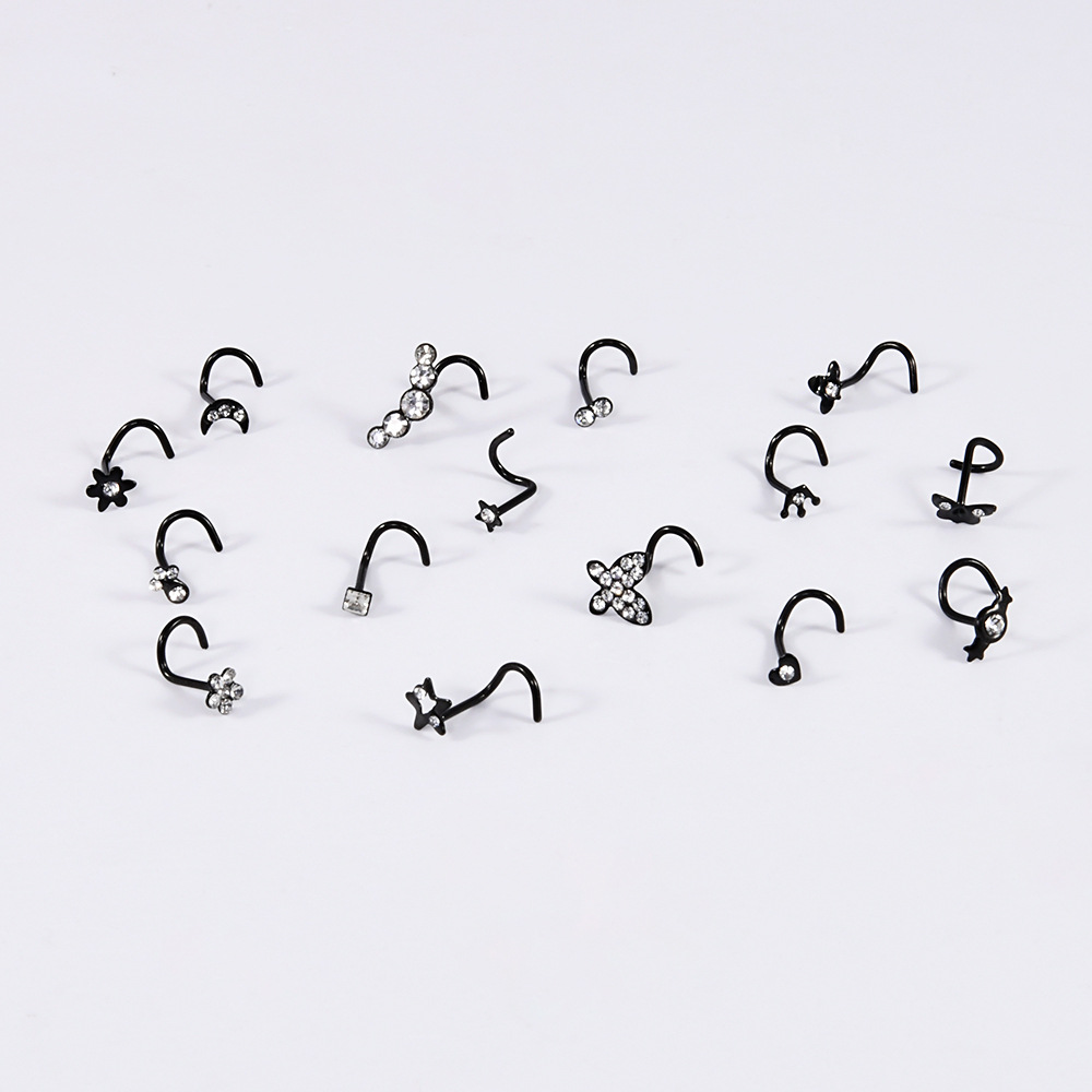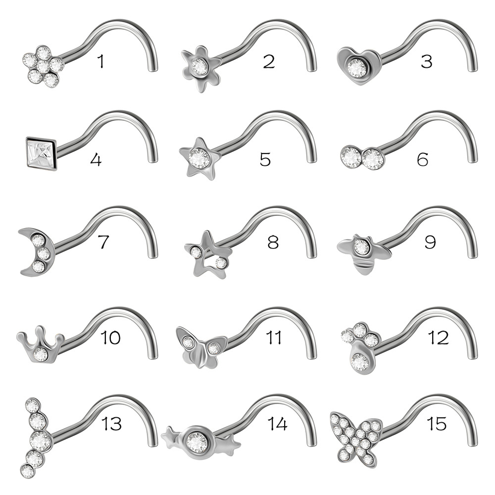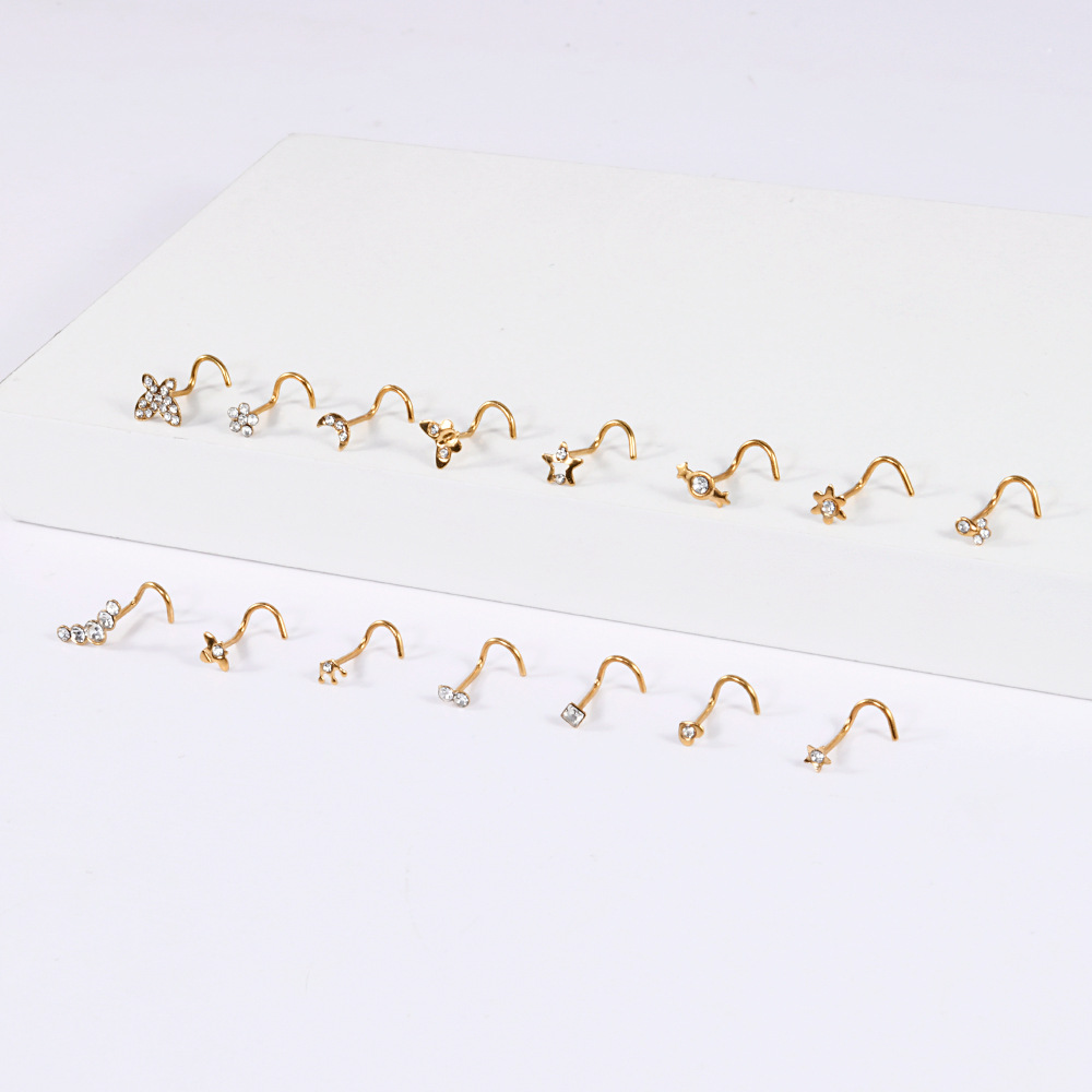 Name: Cross-border stainless steel crown nose stud with flower-shaped nose ring, S-shaped curved rod nose ring, and five-star heart-shaped Czech diamond piercing jewelry.