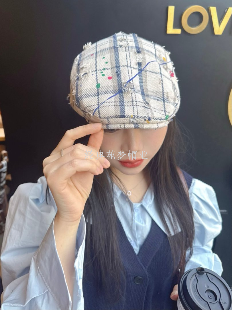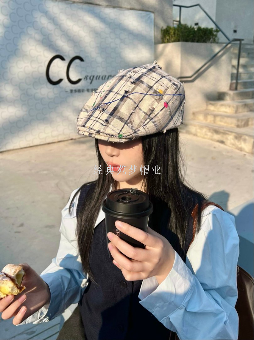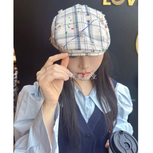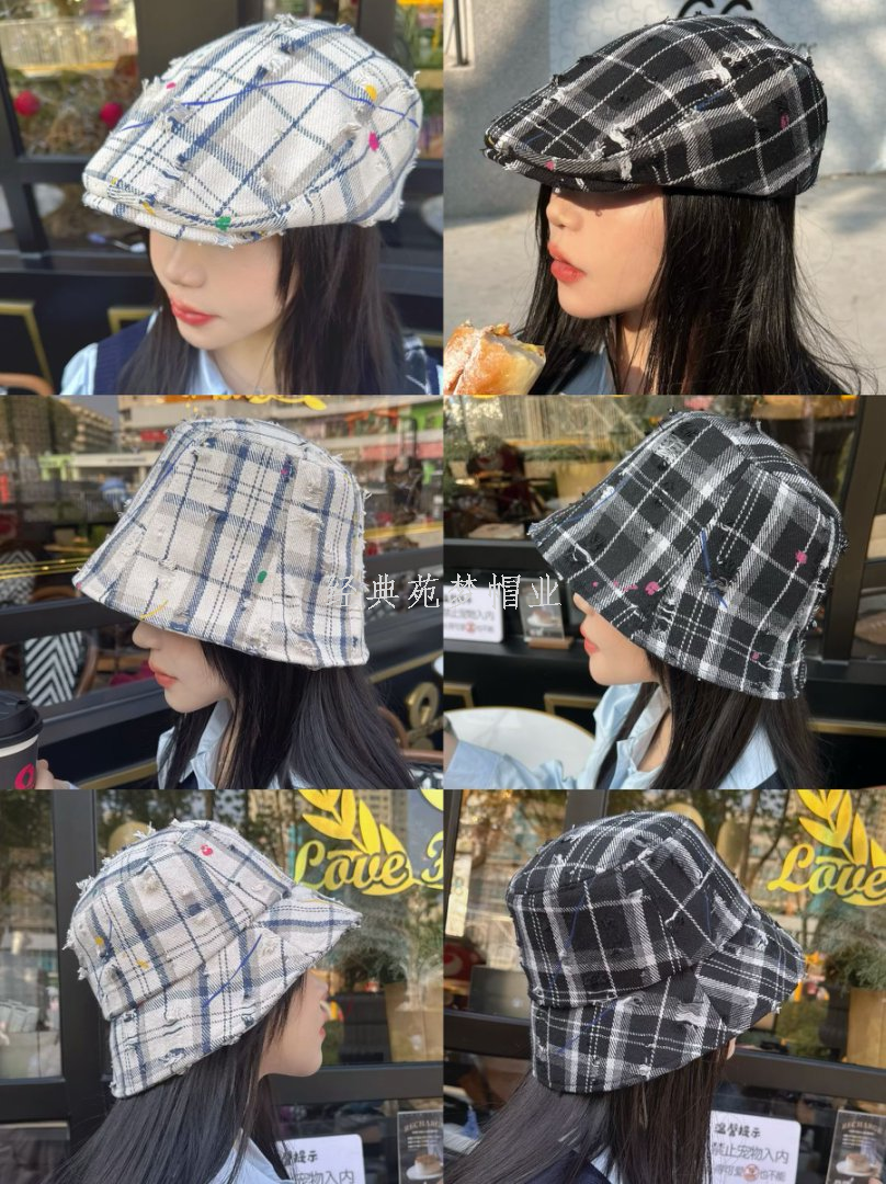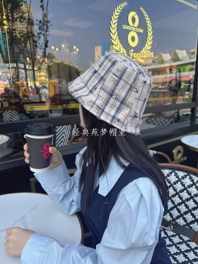 retro make old ripped plaid advance hats women's spring and summer new versatile face-looking small bucket hat same series bucket hat 中文版