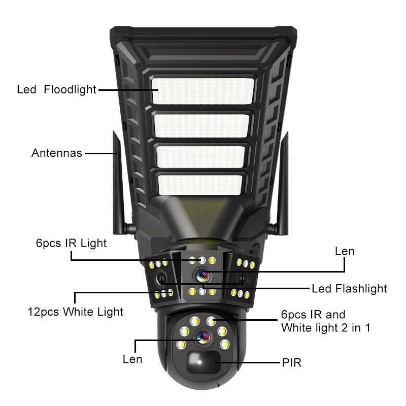 1. 10W solar panel+18000mAh lithium battery,3MP 2. 176pcs led 3. Support AC 5V charging and low power consumption,led white lights+ IR lights 4. Video Compression :H.265 5. Supports 4G SIM card. 6. Two-way real time Audio,App alarm,Full color night vision,Human motion tracking 7. IP66 Waterproof/Weatherproof ,wide angle 8. PTZ Rotation:Pan 355⁰/ Tilt 90⁰