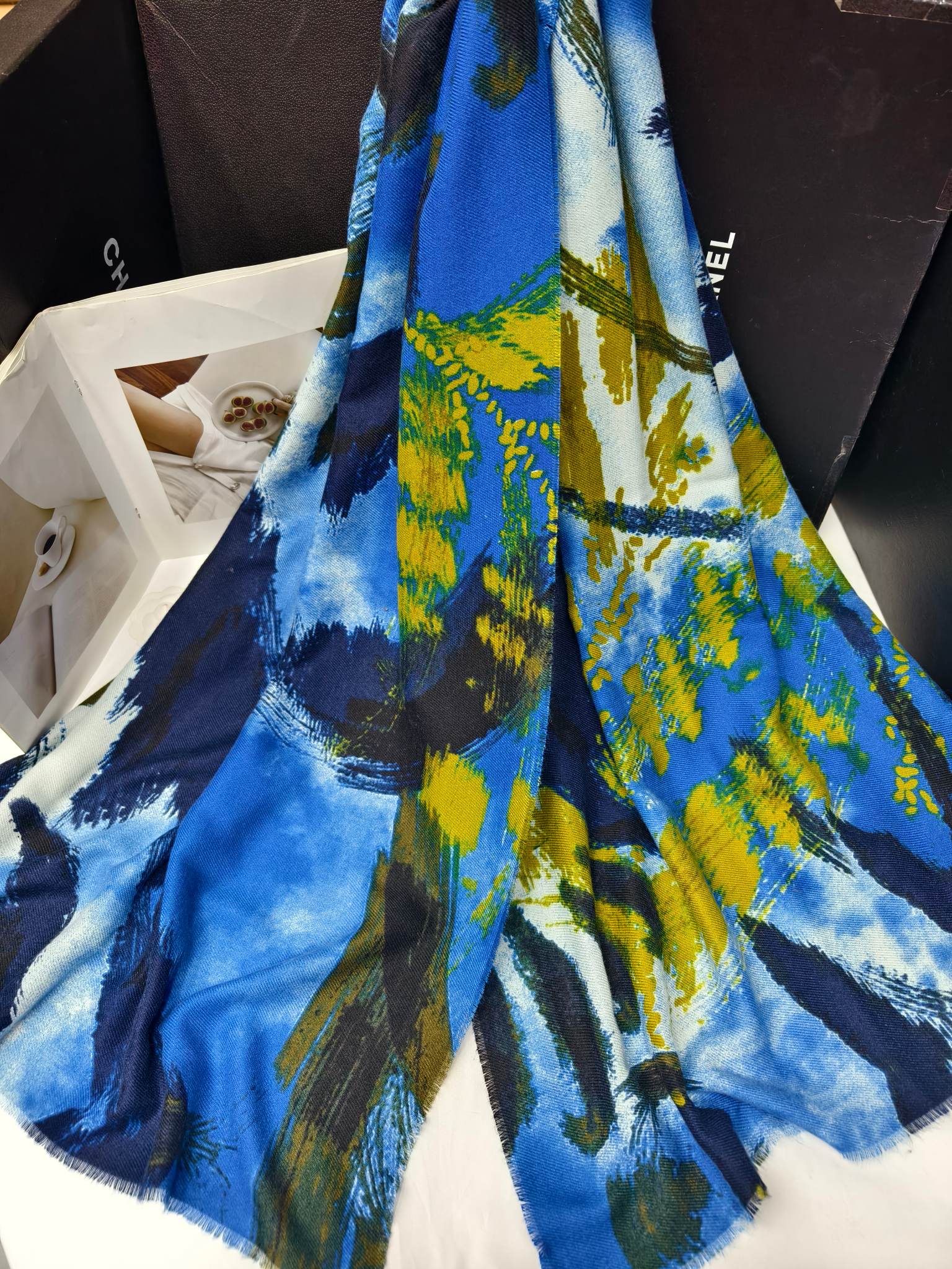 Imitation cashmere scattered hair print, weight: 170 grams, size: 70*180, material: 80% polyester, 20% viscose, item number: 51149319