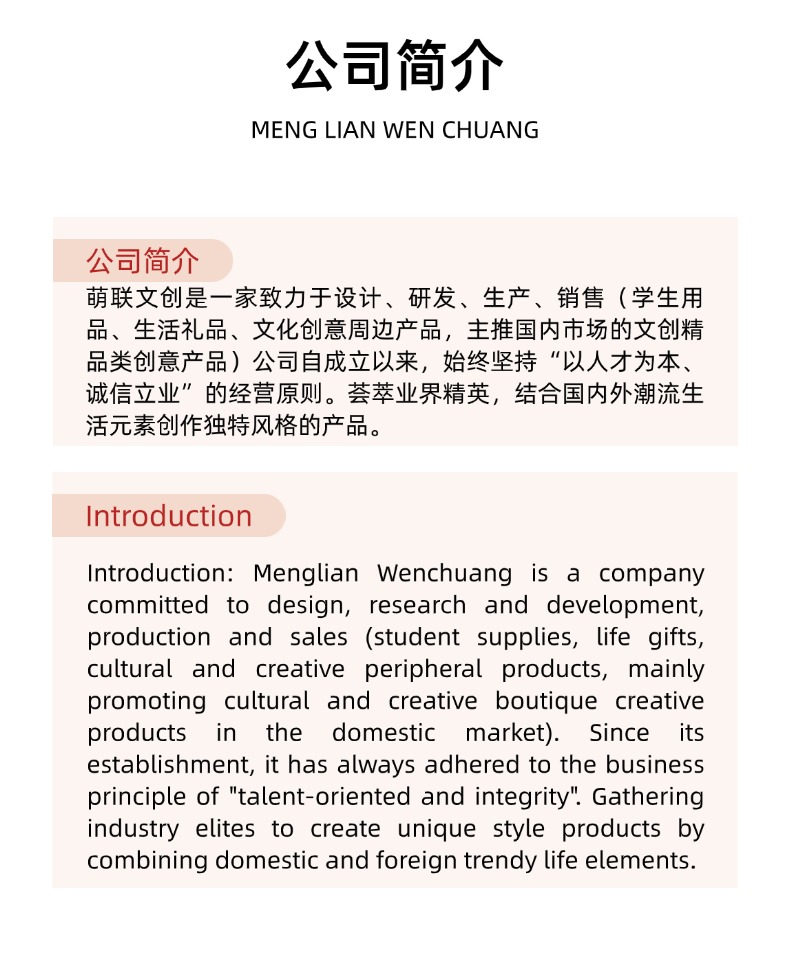 Introduction: Menglian Culture Creationis a company dedicated to the design, research and development, production, and sales of (student supplies, lifestyle gifts, cultural and creative peripherals, with a focus on cultural and creative premium products in the domestic market). Since its establishment, the company has always adhered to the philosophy of“People-oriented and Integrity-based Business”The company's business philosophy is to gather elite professionals from the industry, combine domestic and international trends in lifestyle elements to create unique style products.