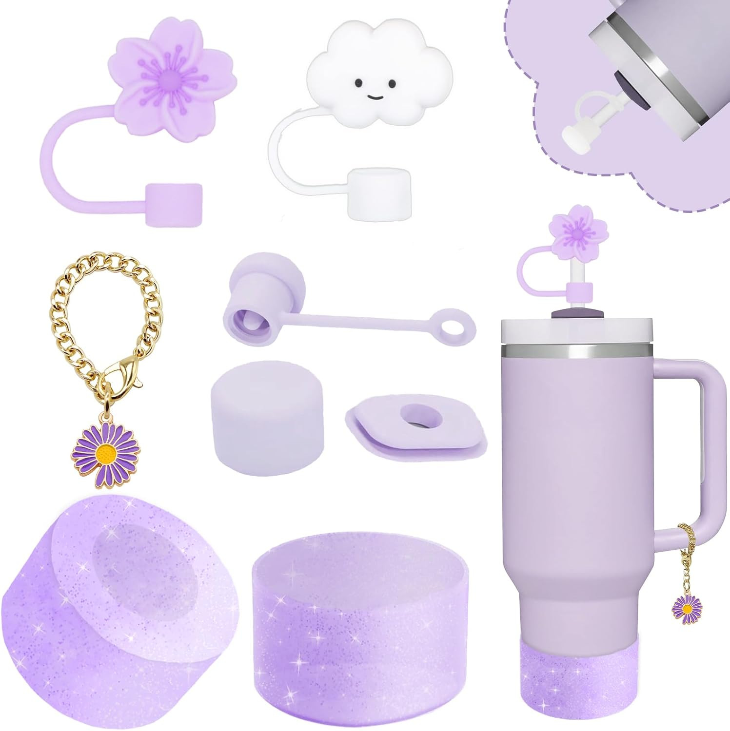 The set includes two 10mm straw lids, a hanging chain, a leak-proof stopper set, and one cup cover (diameter 7.5).