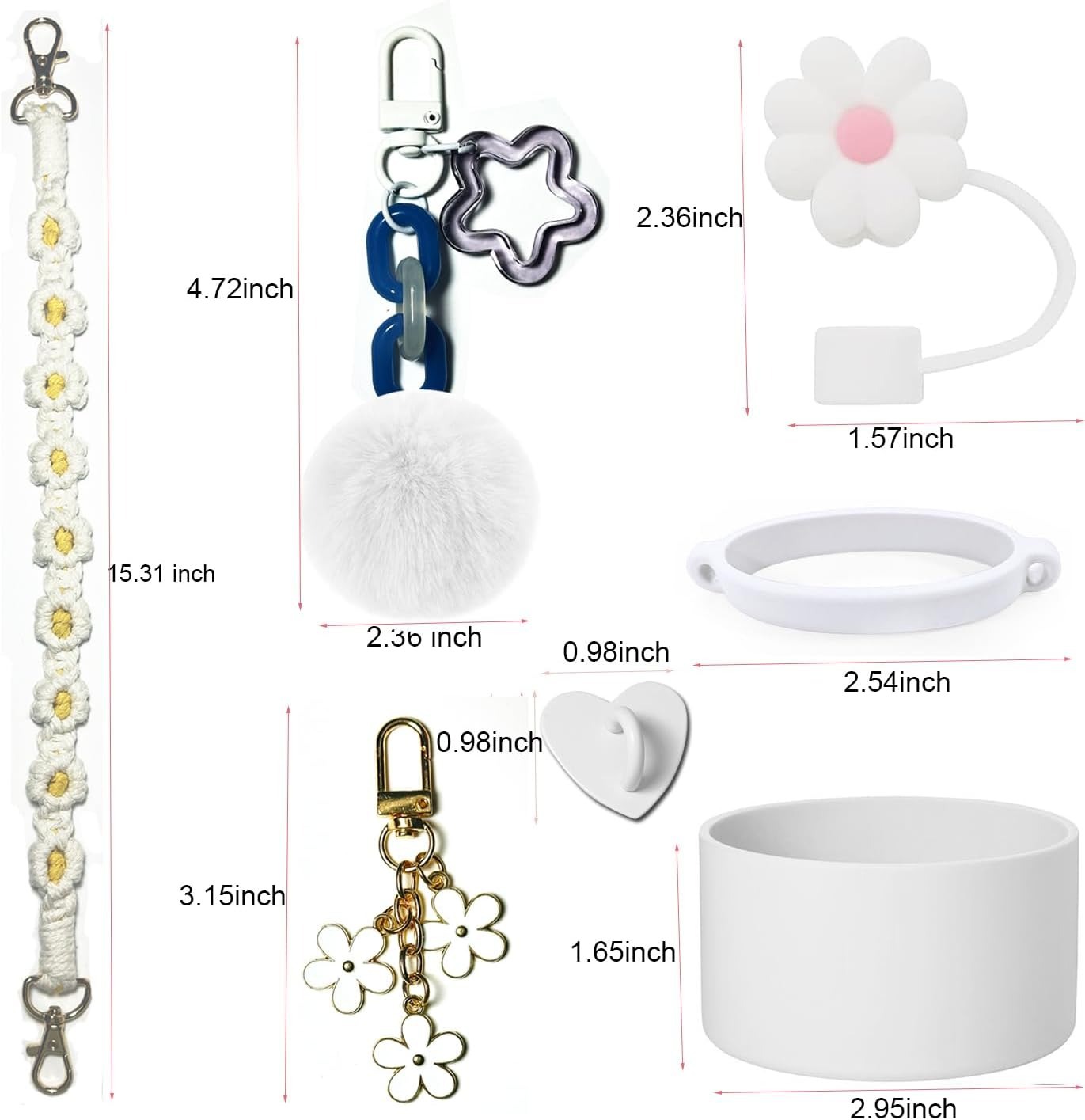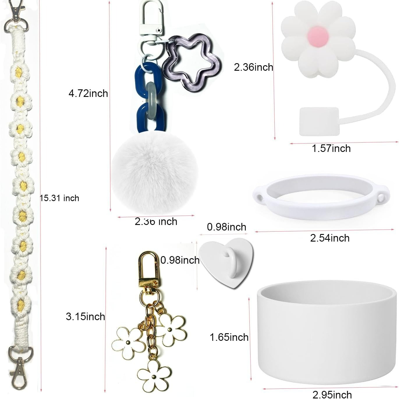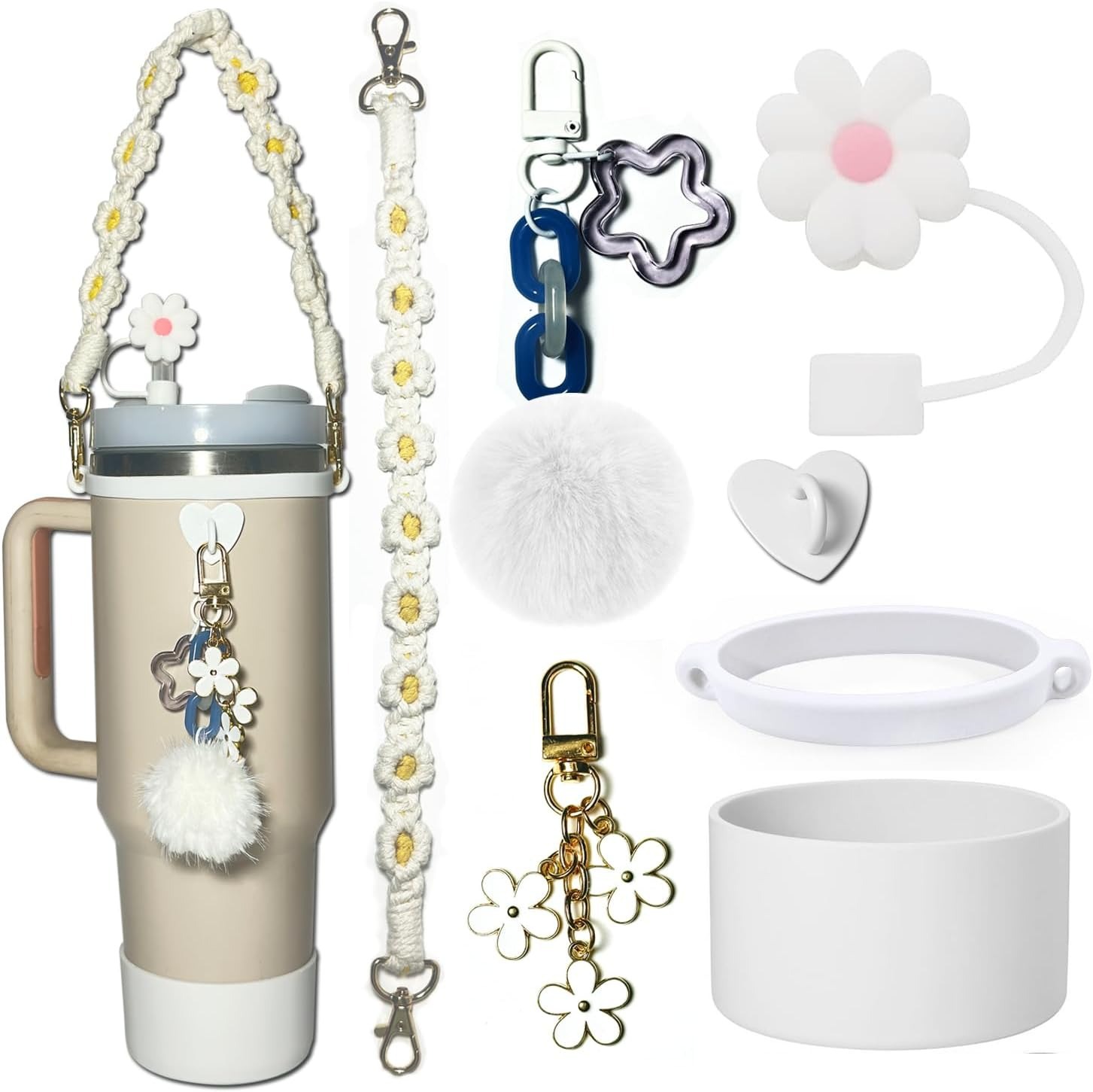The set includes 1 10mm straw cap, 1 fixed piece, 1 silicone ring, 1 carry strap, 1 cup cover, 2 hanging pieces, totaling 7 pieces.
