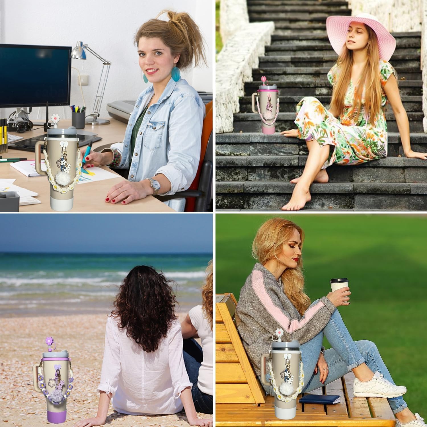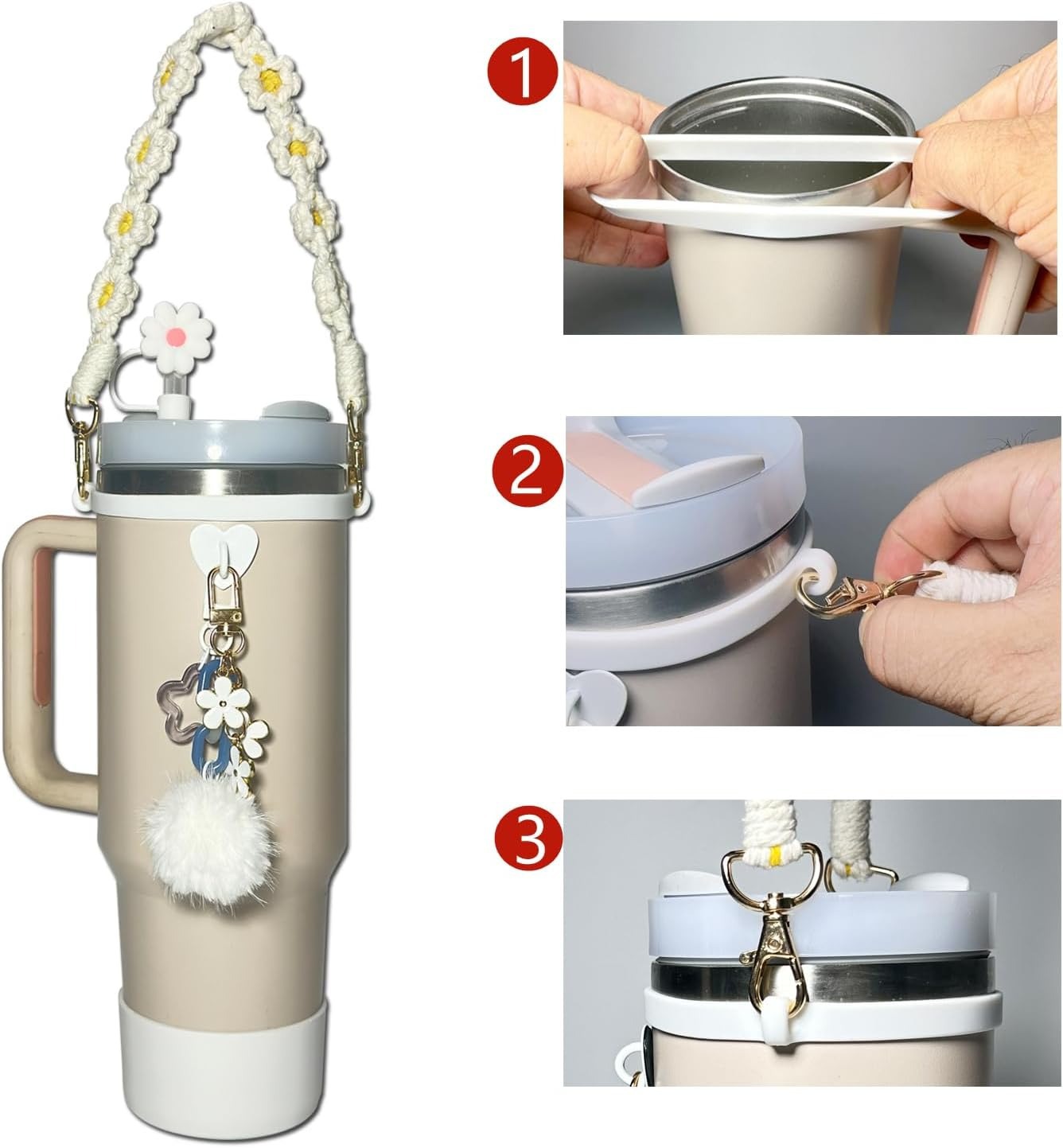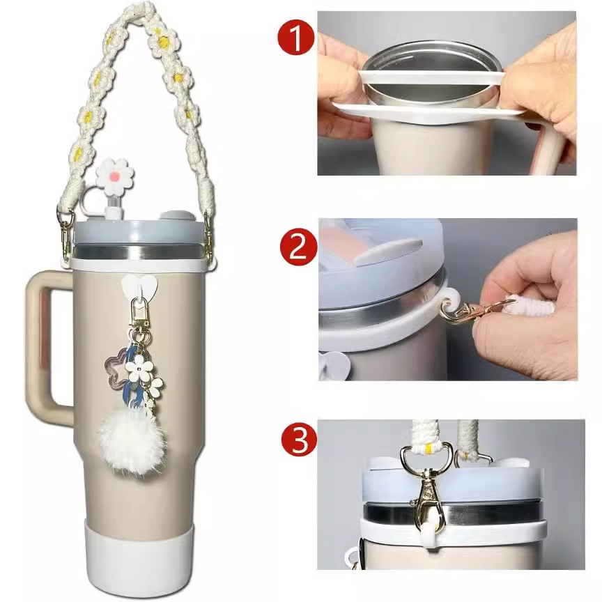 The set includes 1 10mm straw cap, 1 fixed piece, 1 silicone ring, 1 carry strap, 1 cup cover, 2 hanging pieces, totaling 7 pieces.