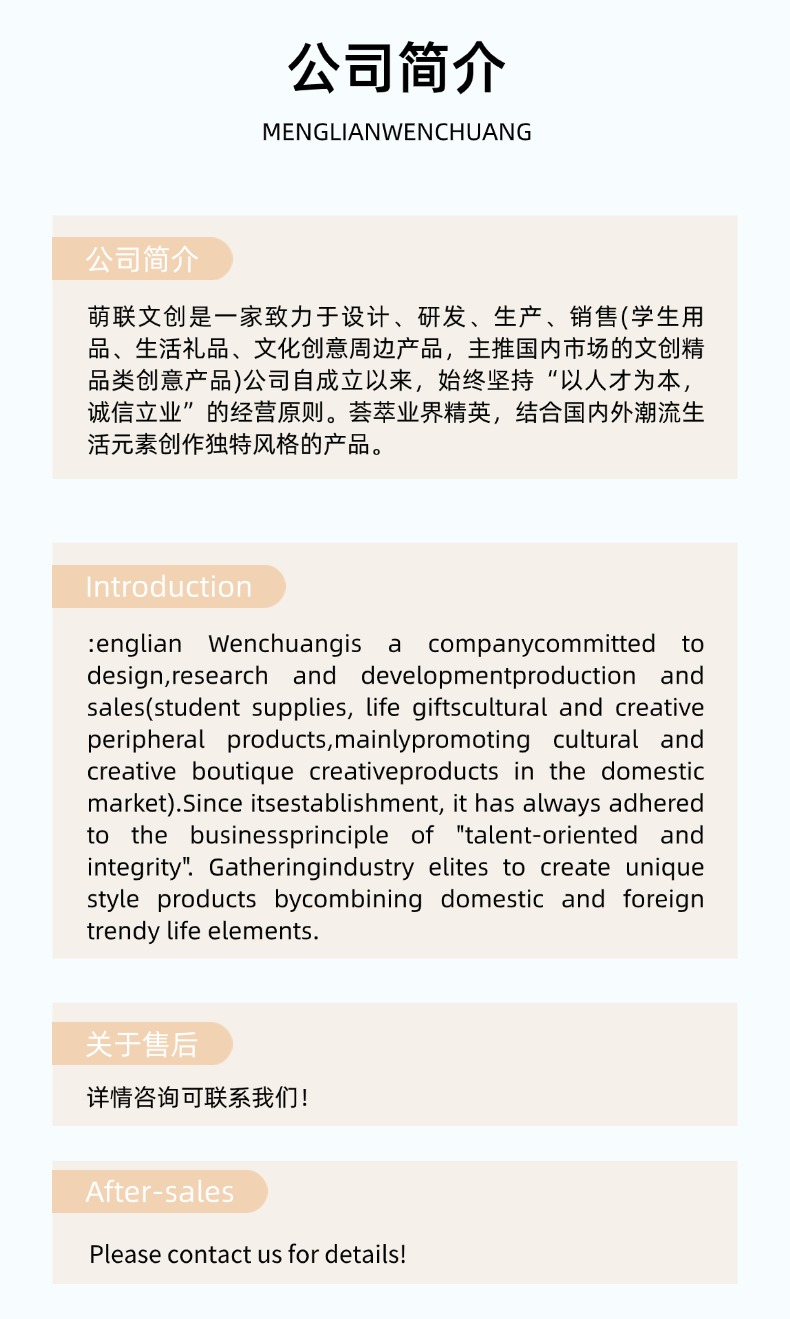 Introduction: Menglian Culture Creationis a company dedicated to the design, research and development, production, and sales of (student supplies, lifestyle gifts, cultural and creative peripherals, with a focus on cultural and creative premium products in the domestic market). Since its establishment, the company has always adhered to the philosophy of“People-oriented and Integrity-based Business”The company's business philosophy is to gather elite professionals from the industry, combine domestic and international trends in lifestyle elements to create unique style products.