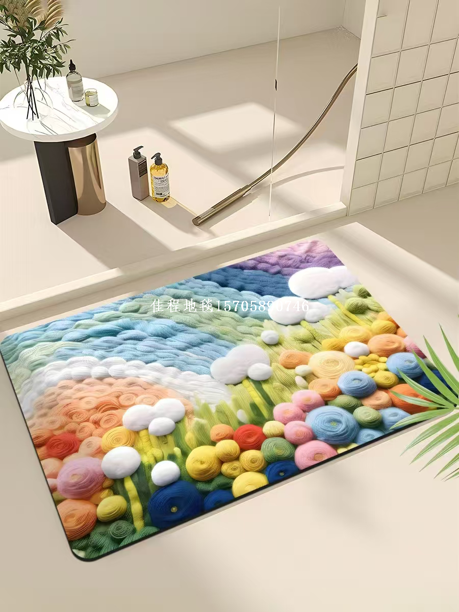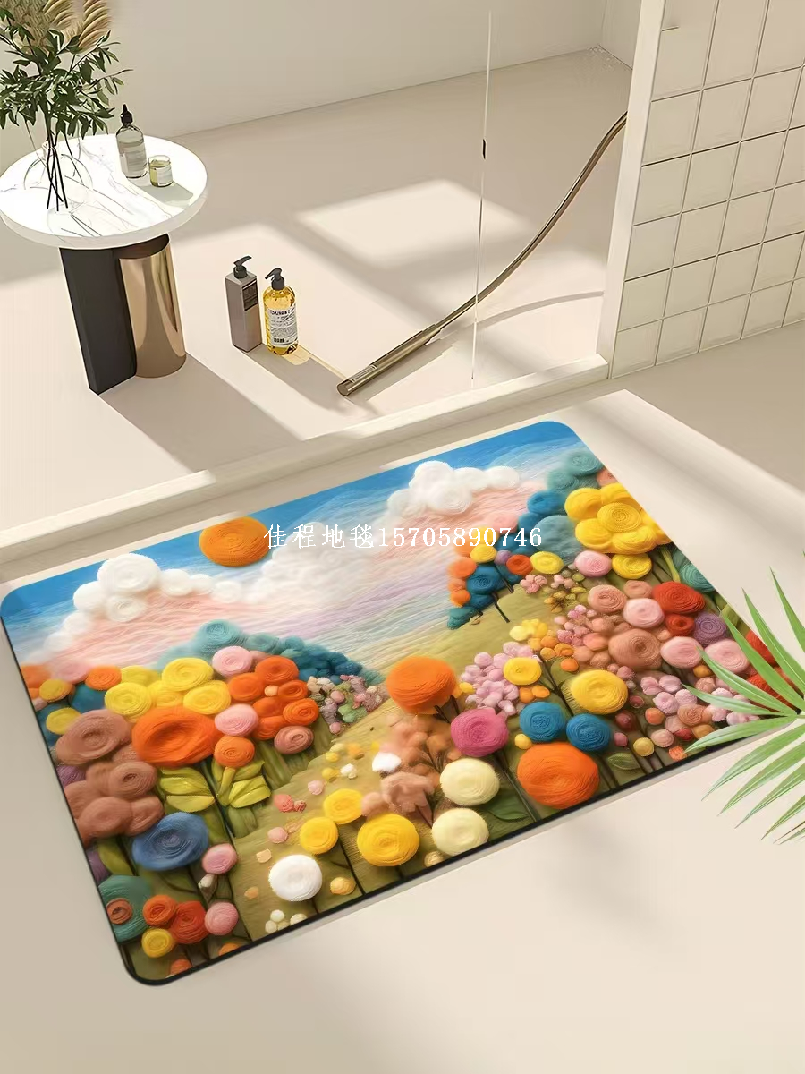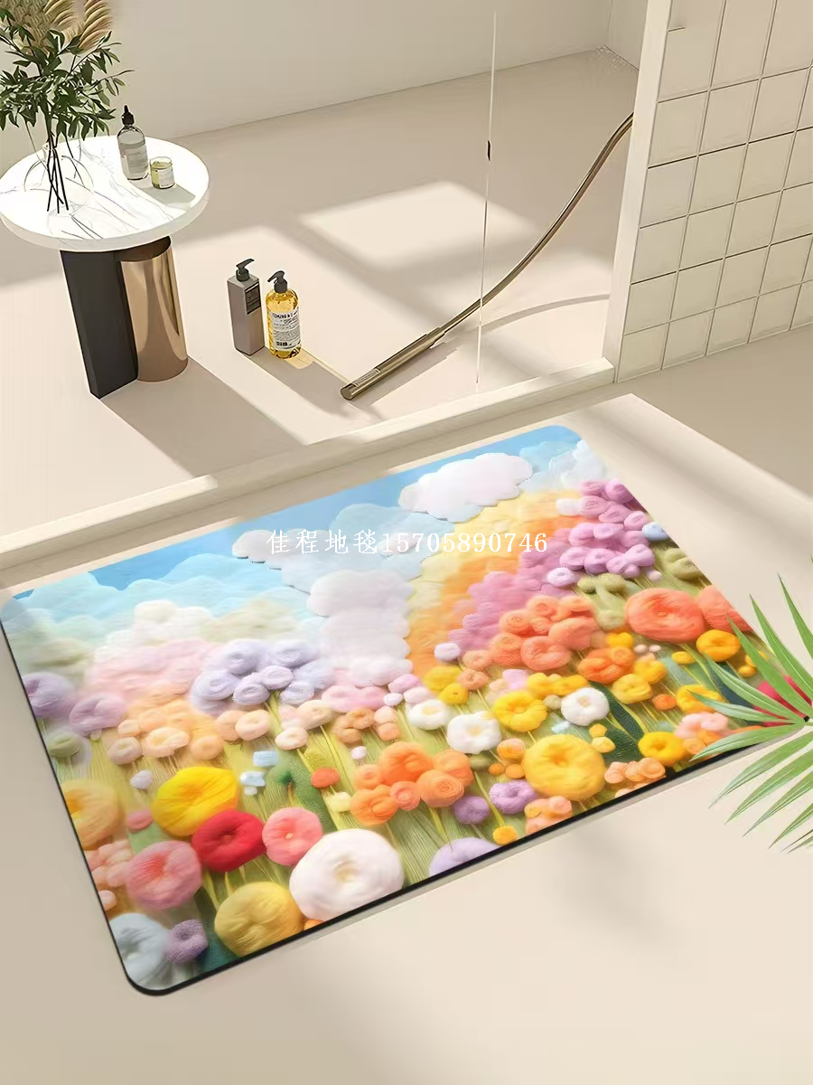 2mm Thickness New Model Quickly Absorbing Anti-skid Door Mat with 3D Printing Floor Mat Dry Foot Mat Carpet Kitchen Mat Soft Diatomite Mat Quality of the product is good, with many patterns, clear and beautiful. The bottom is made of rubber material, the product size is 38*58cm, and it is packaged in 100 pieces per package with a woven bag.