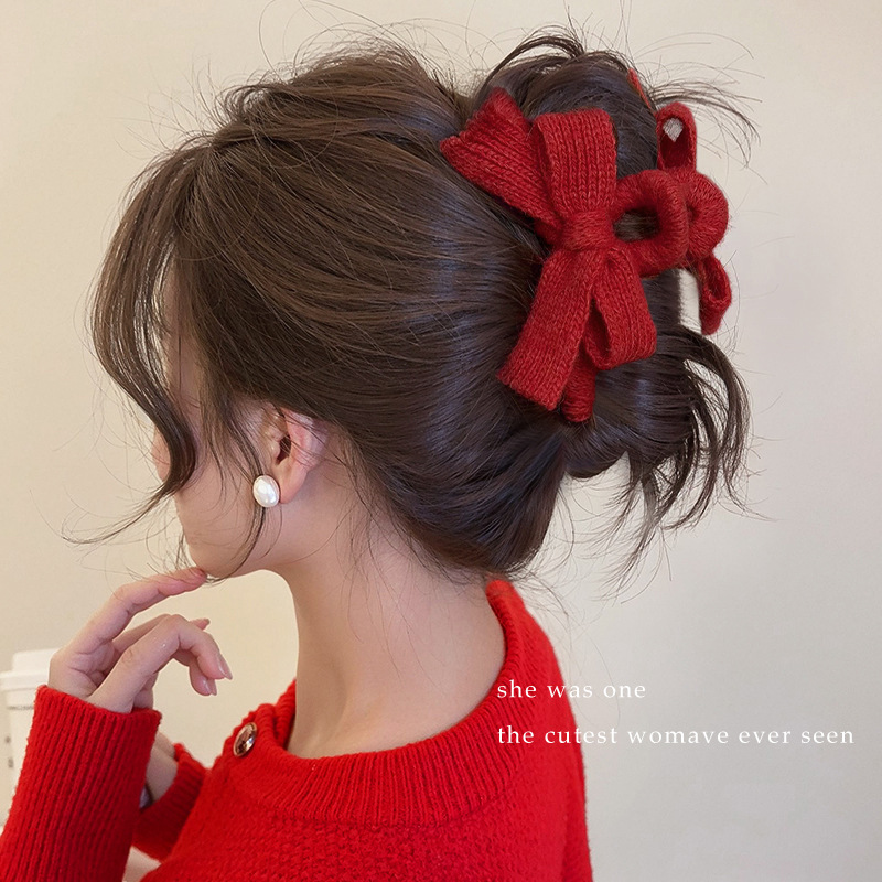 red knitted bow claw clip