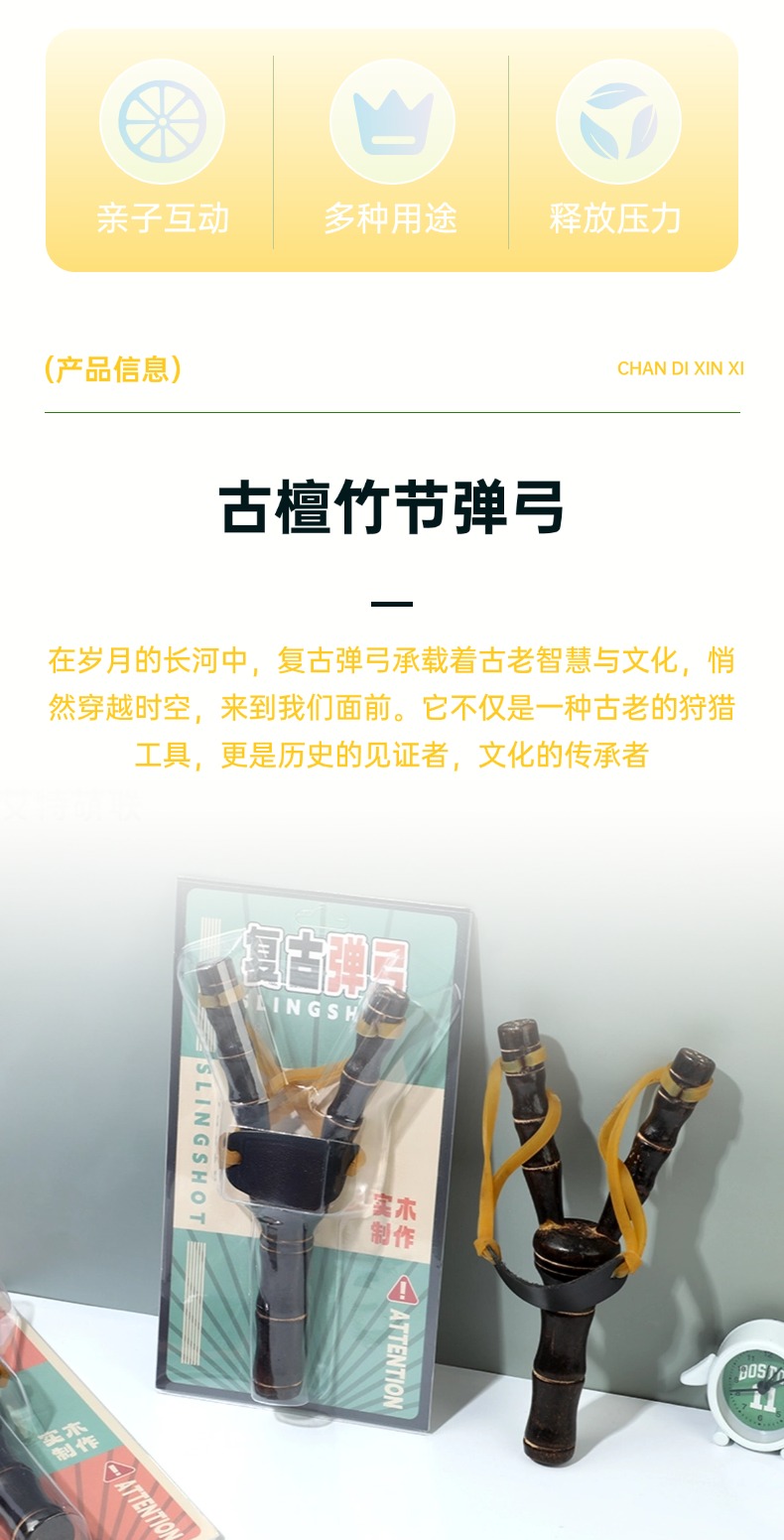 The design of the ancient sandalwood bamboo section slingshot retains the minimalist style of traditional slingshots, while integrating modern aesthetic elements. Its bamboo section shape is unique, with the dark color of sandalwood texture contrasting with the natural color of the bamboo section, showcasing a simple and elegant aesthetic.