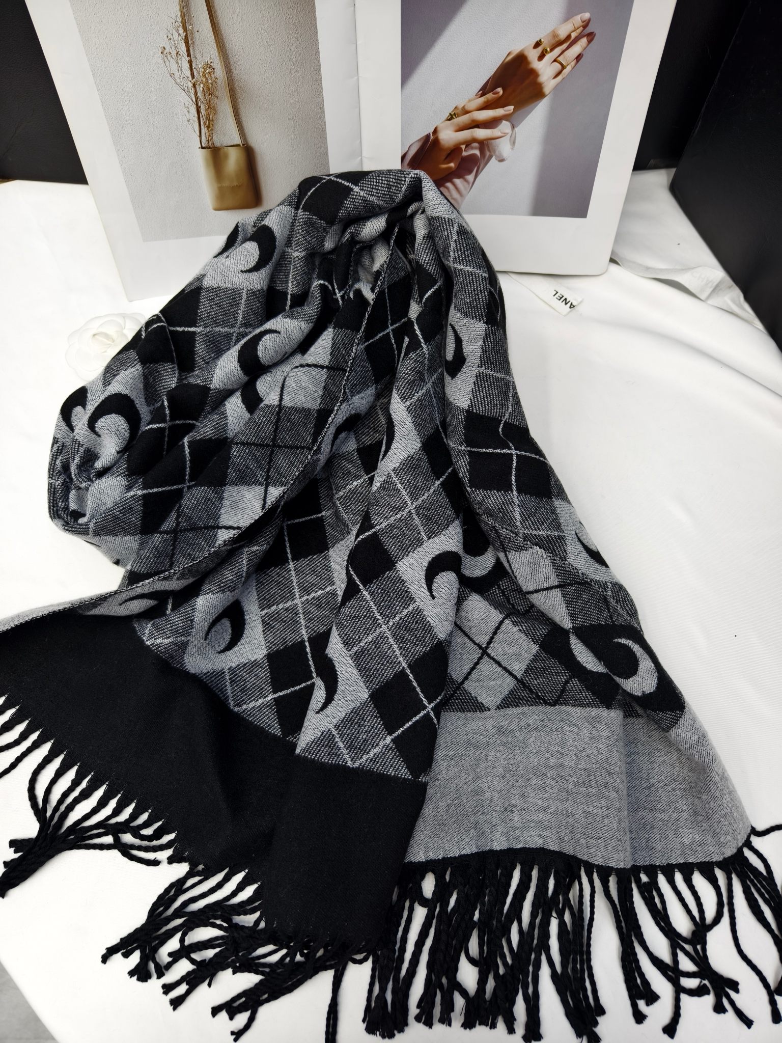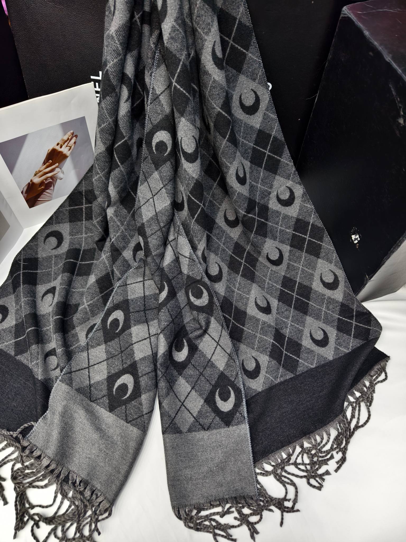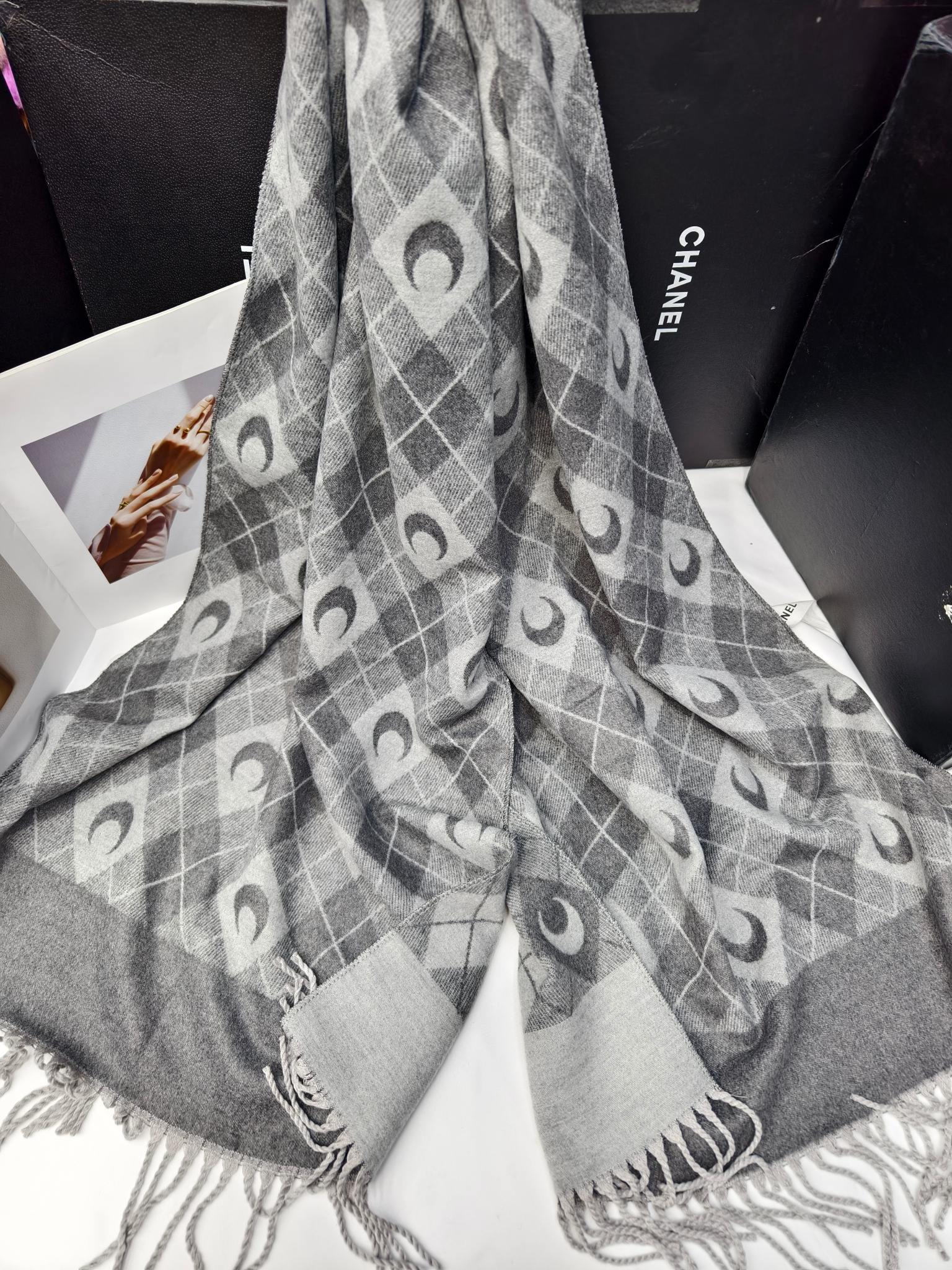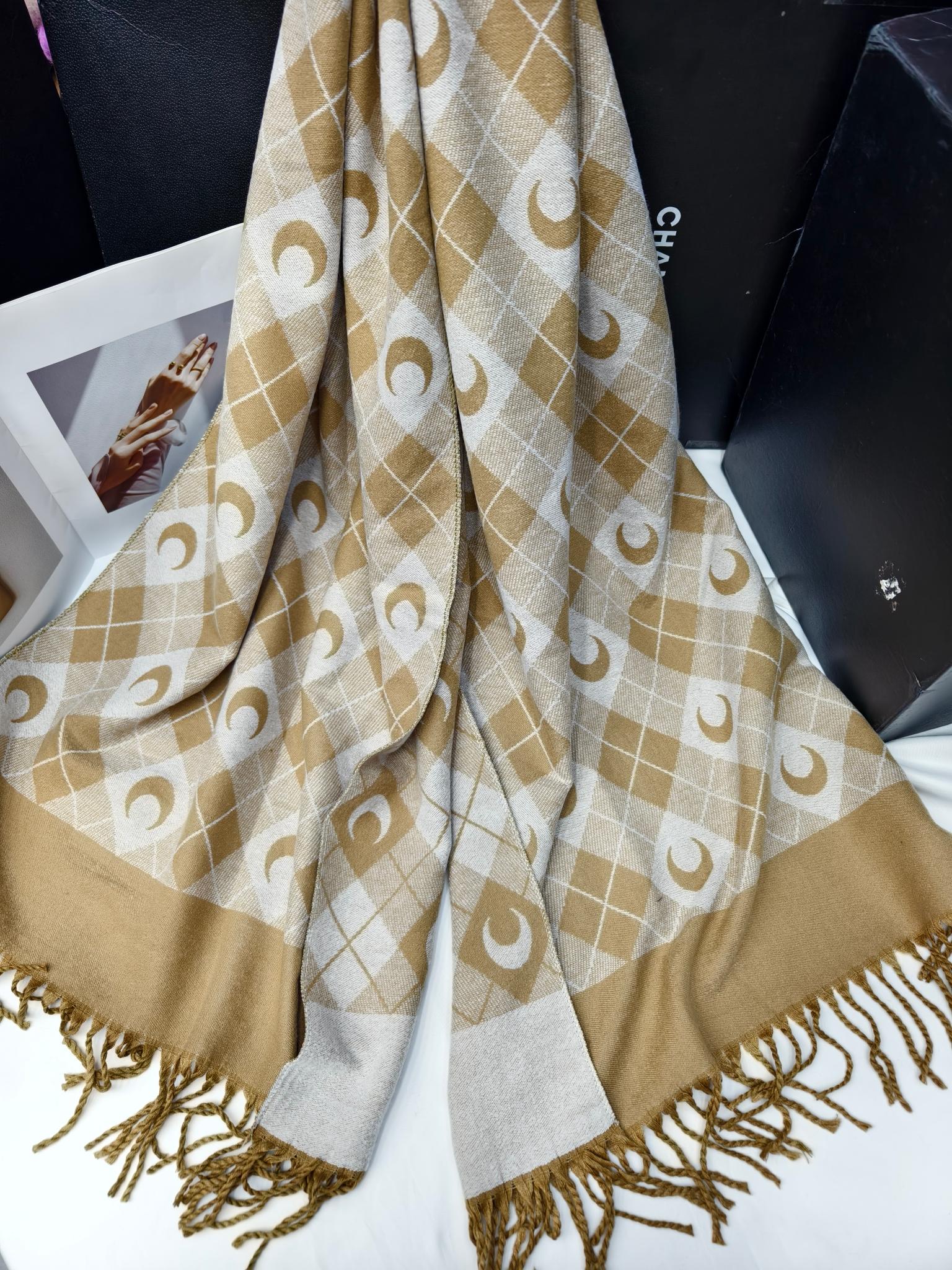 New model, order-specific, moon-shaped diamond check pattern, material: core-spun yarn, weight: 320 grams, size: 60*190 cm, item number: 67185340.