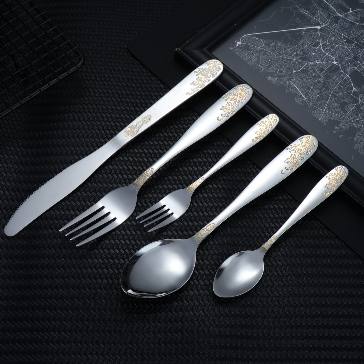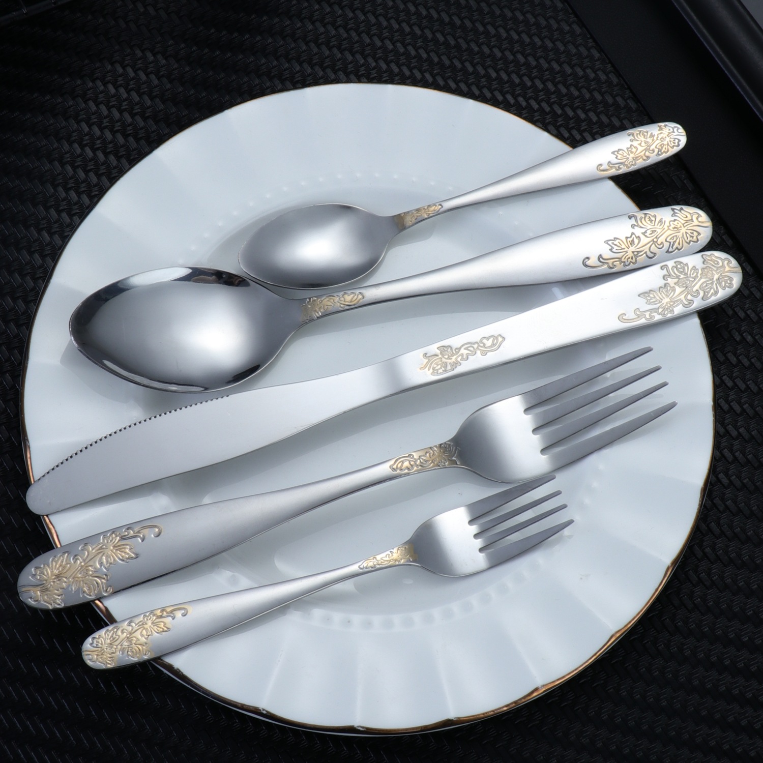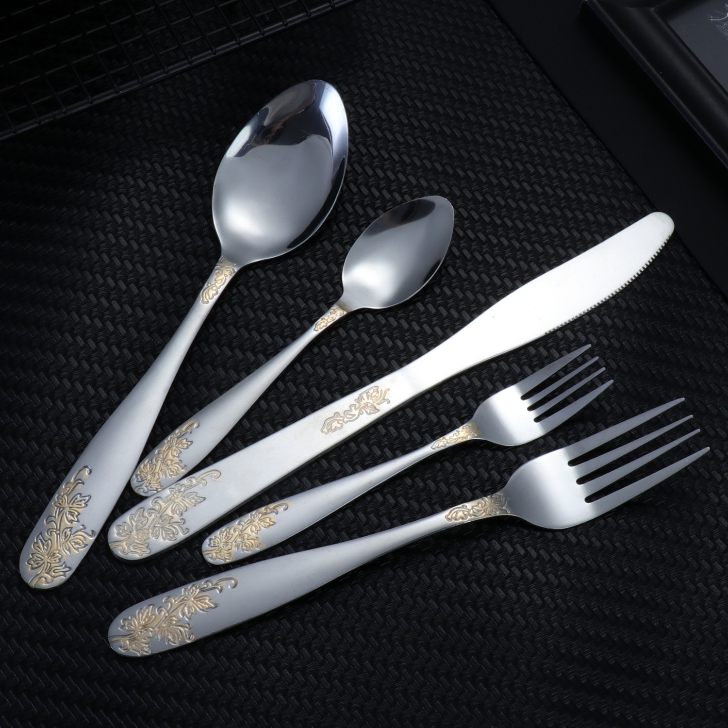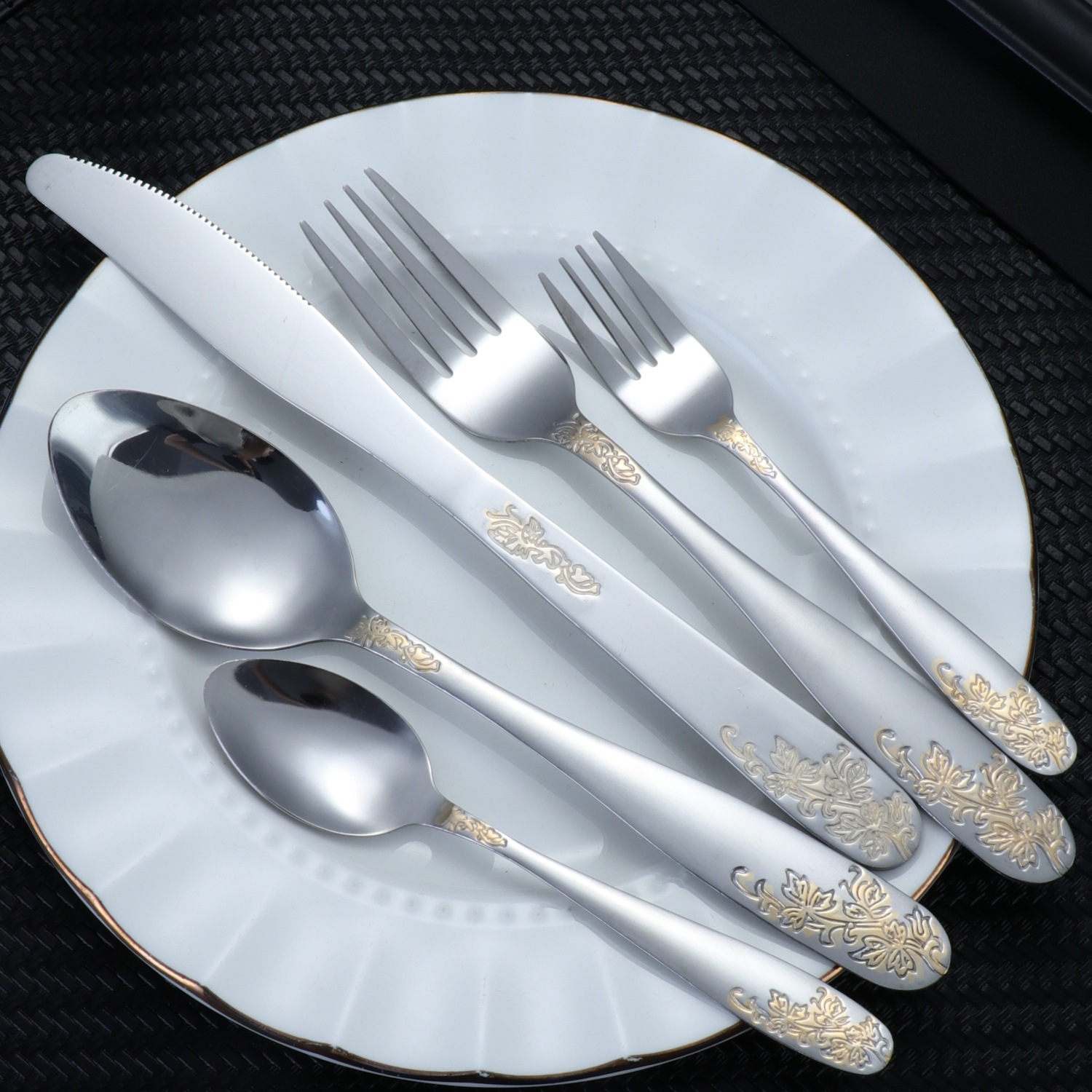 [relief flower and leaf] 410 stainless steel tableware light luxury gold-plated western food knife, fork and spoon suit relief pattern