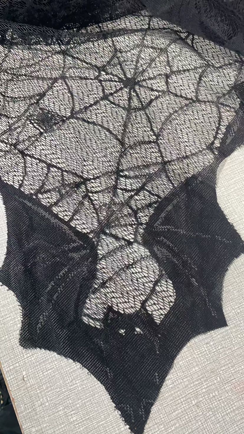 Halloween cape with black lace spider web fabric and bat shoulder piece for Halloween performance