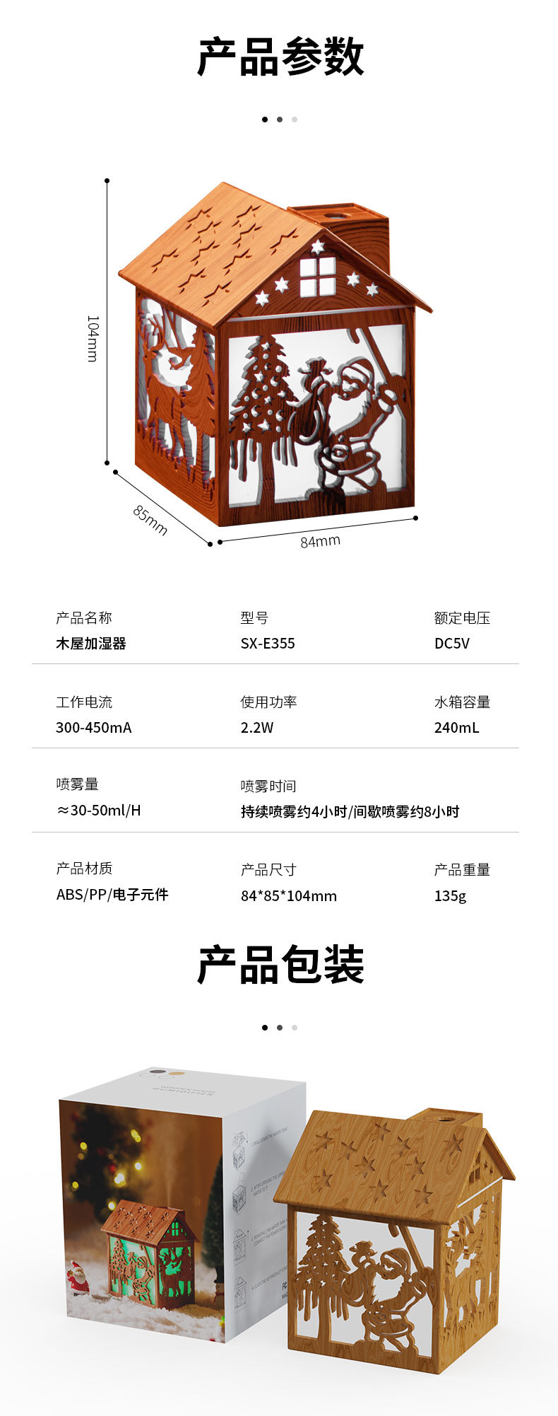 Product Material: ABS/PP/Electronic Components Packing Quantity: 80PCS Tank capacity: 240ml Time of Use: Continuous Spraying for About 4 Hours/Intermittent Spraying for About 8 Hours Spray volume: about 30-50ML/h Working current: 300-450mA Power Usage: 2.2W Product size: 84*85*104mm Product color box size: 86.5*85.5*106.5mm Crate Size: 44.7*35.6*44.9CM Net Weight/Gross Weight: 135g/184g Net/Gross Weight: 14.7kg/15.6kg Style/Color: Light Wood Grain, Dark Wood Grain