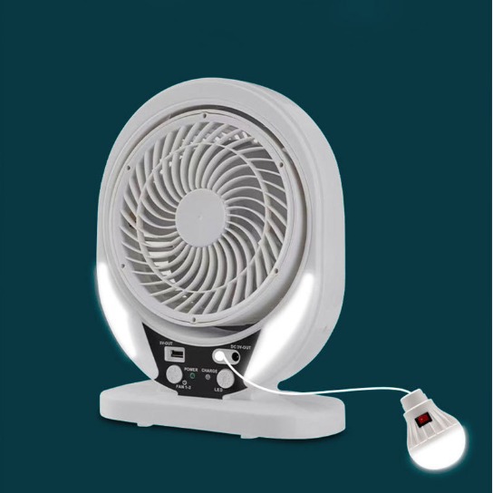 Exporting solar powered electric fans with energy-saving LED lighting and emergency function, suitable for branding. It can be plugged into 110V to 240V AC power or charged by solar panels.