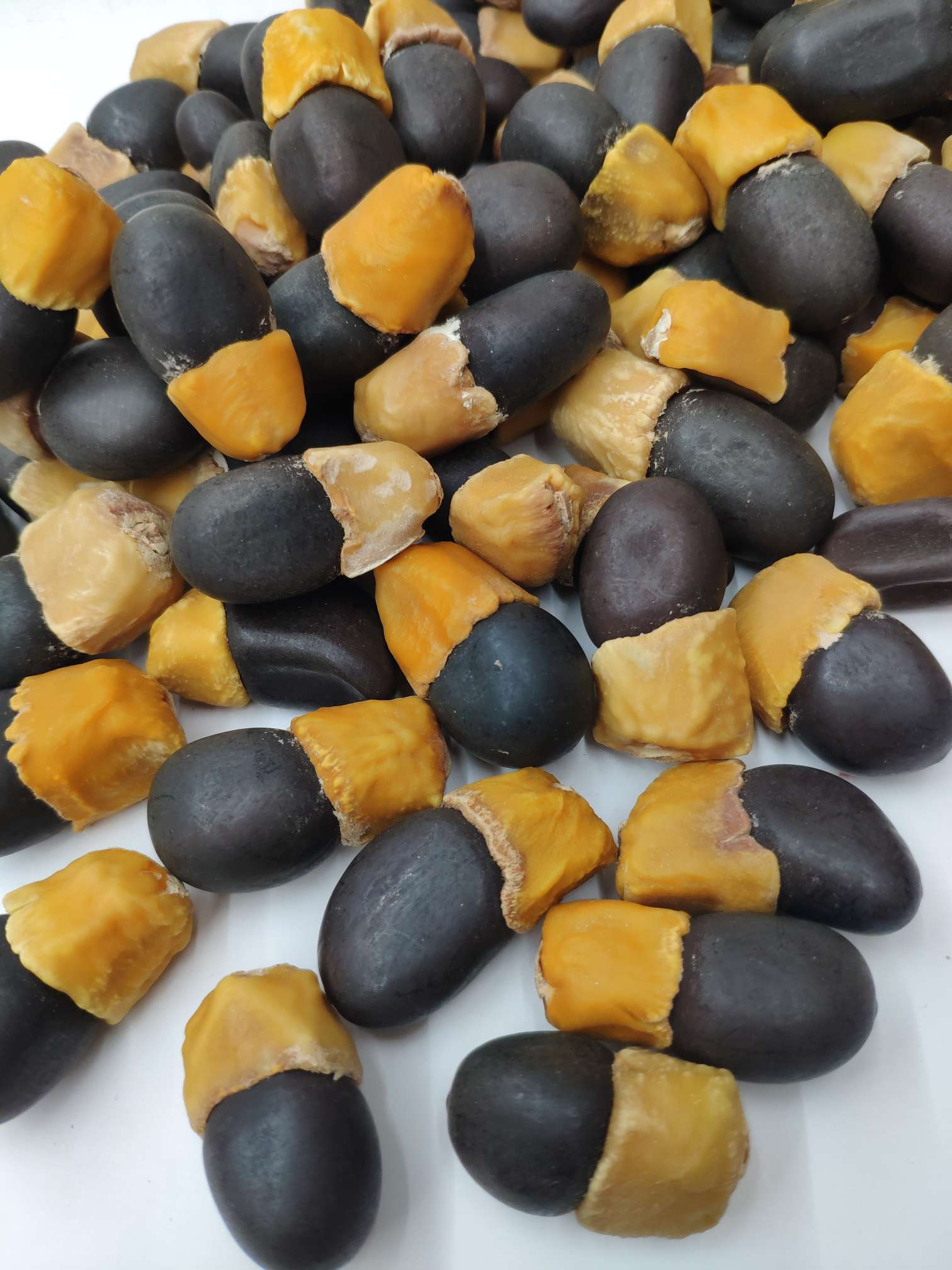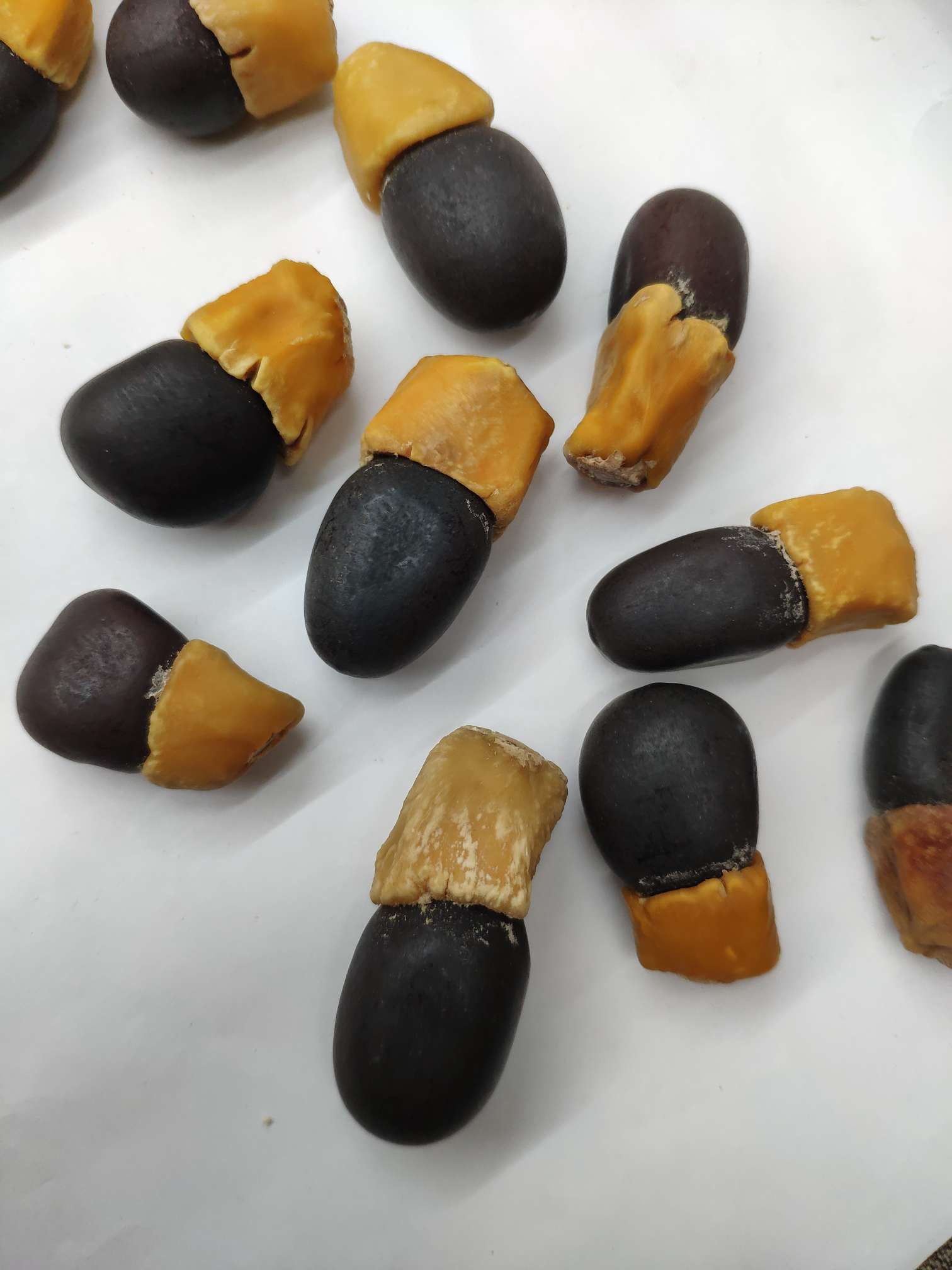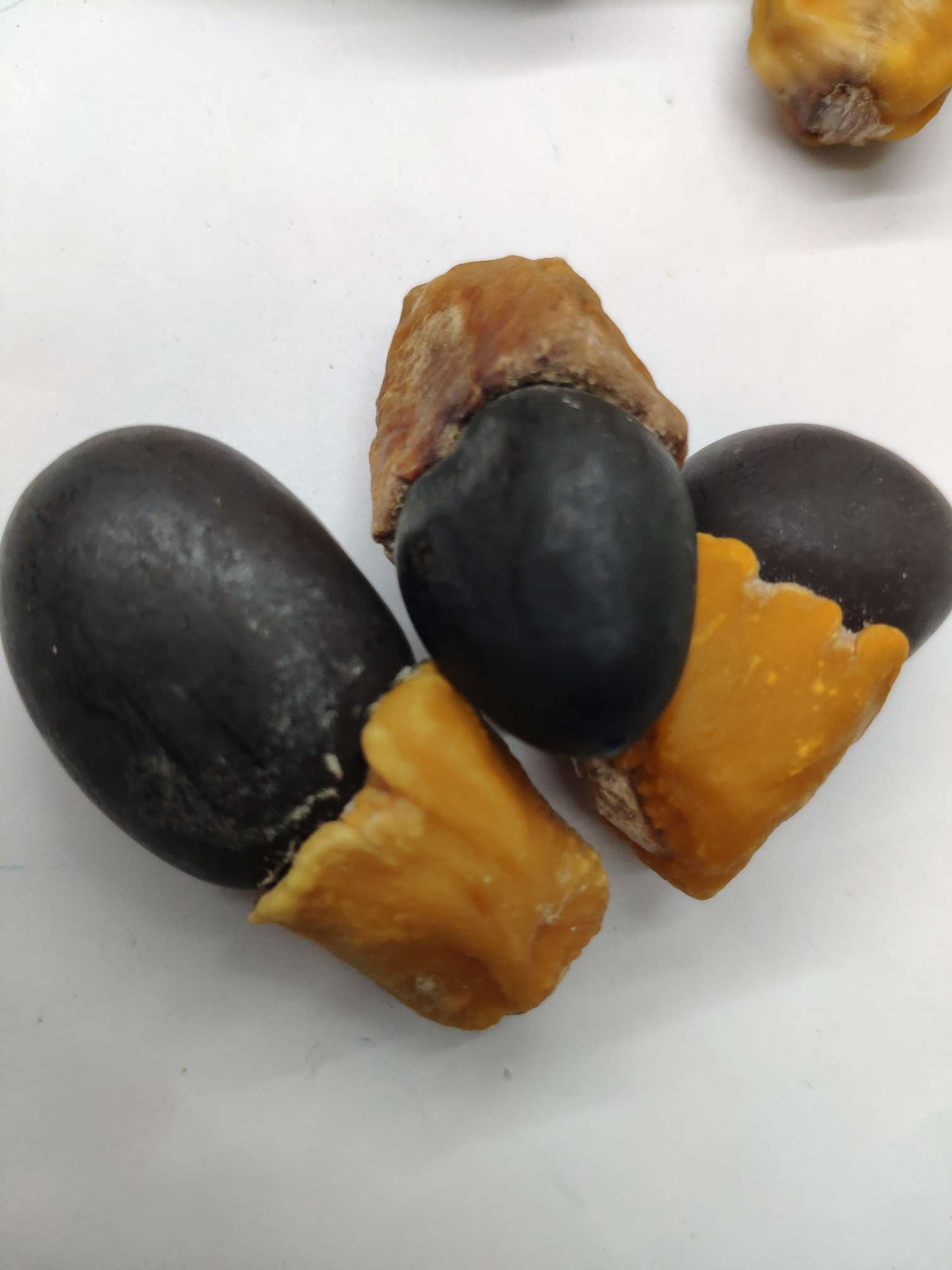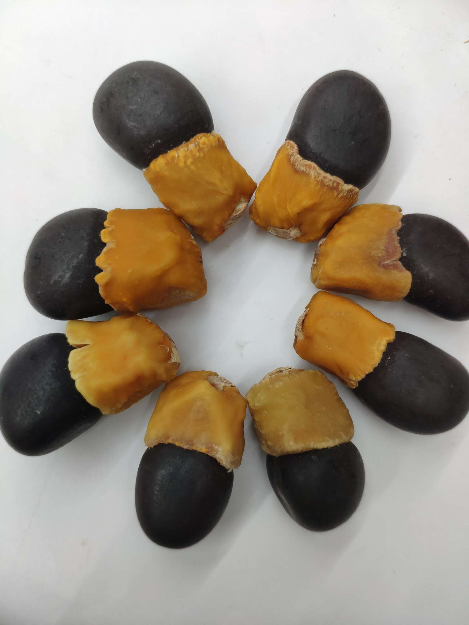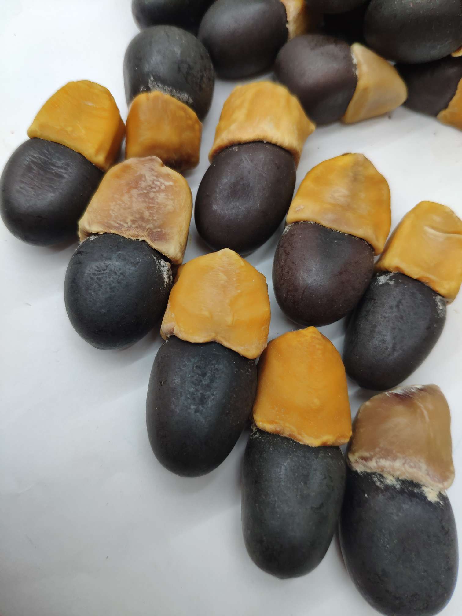 The seeds of the "maya fruit" are long and oval in shape, resembling a eggplant. The lower half is a hard, dark brown or black seed kernel, while the upper half is a waxy pseudocarp, which is typically light yellow to brown in color.