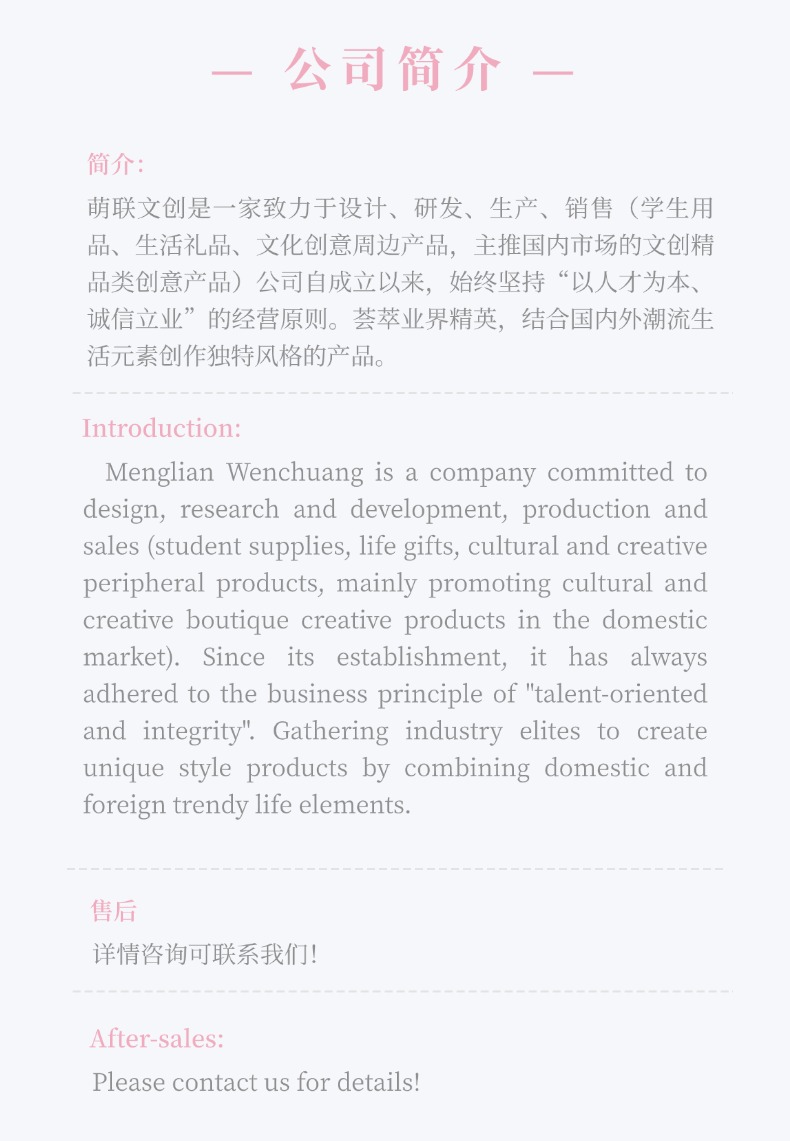Introduction: Menglian Culture Creationis a company dedicated to the design, research and development, production, and sales of (student supplies, lifestyle gifts, cultural and creative peripherals, with a focus on cultural and creative premium products in the domestic market). Since its establishment, the company has always adhered to the philosophy of“People-oriented and Integrity-based Business”The company's business philosophy is to gather elite professionals from the industry, combine domestic and international trends in lifestyle elements to create unique style products.