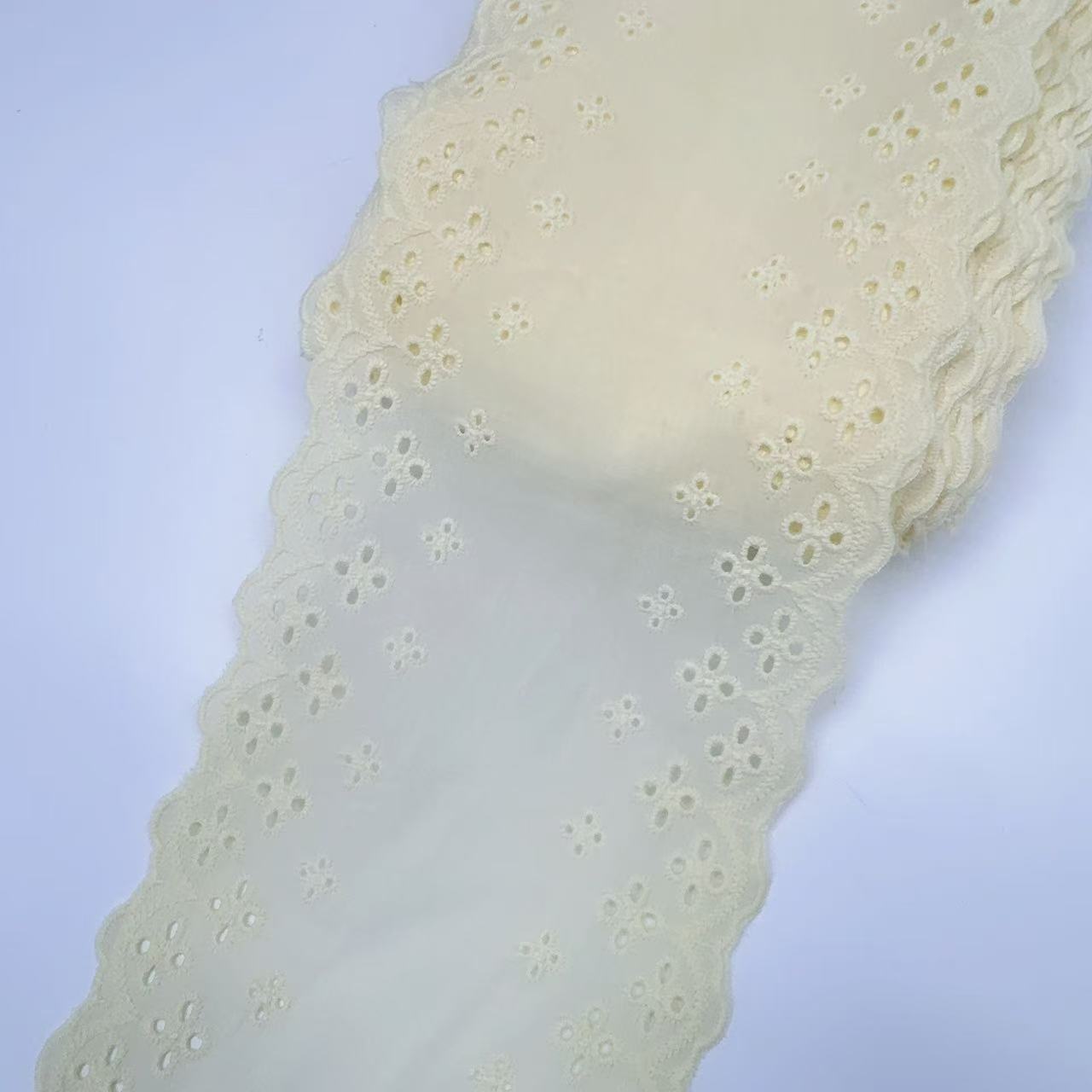 Embroidery edge products are manufactured in one piece, and it may occur that some positions have skipped stitches.It's normal.