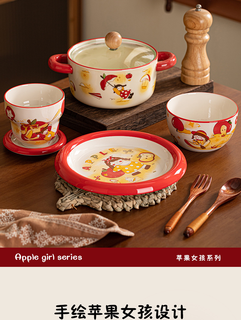 4.5-inch ruyi bowl +8-inch round edge plate-milk white glaze apple girl-2 pack