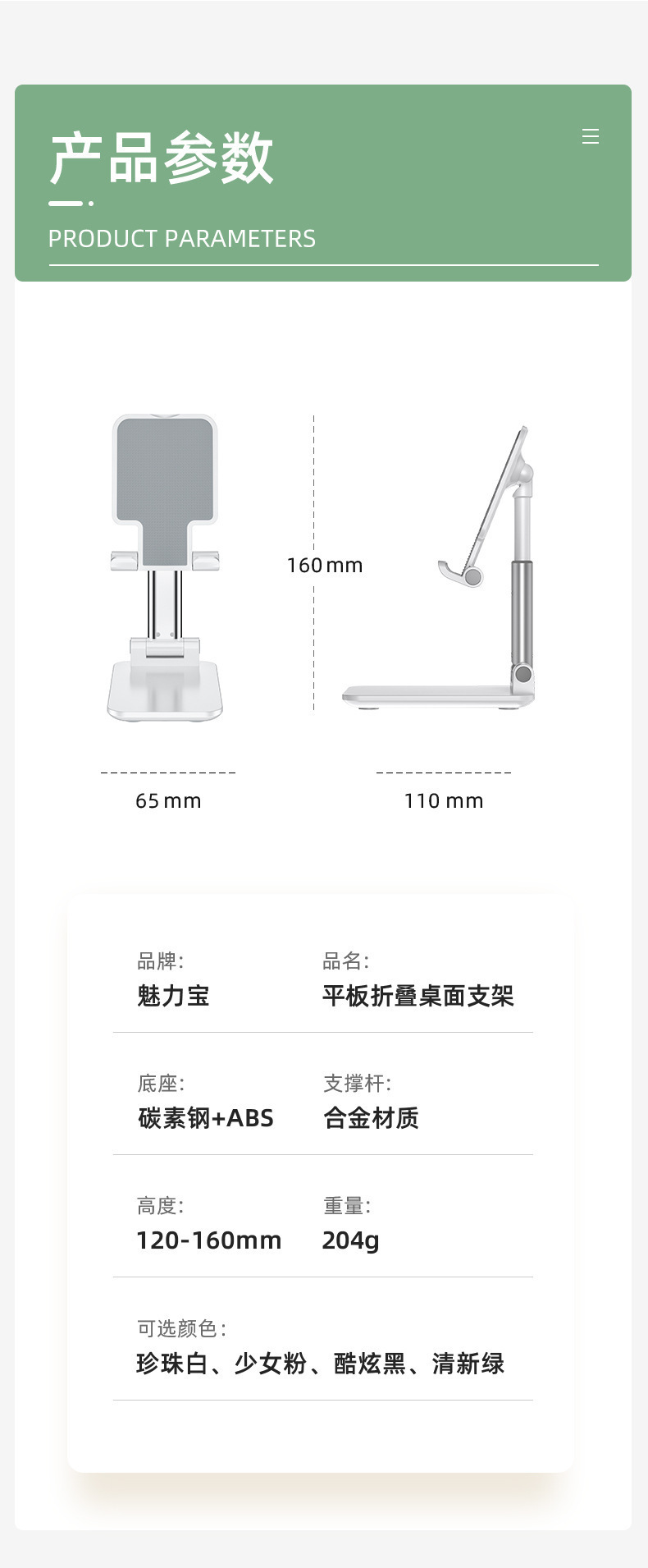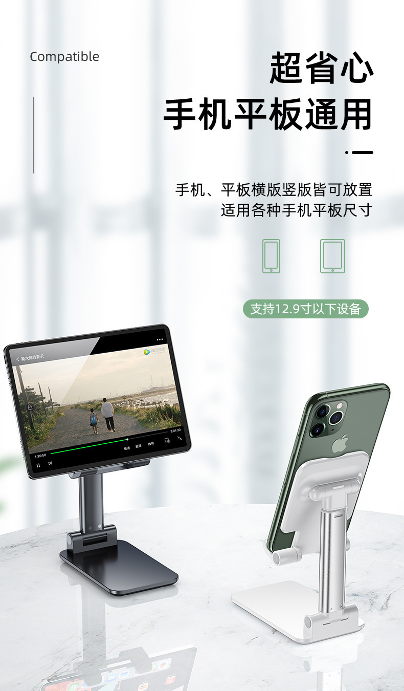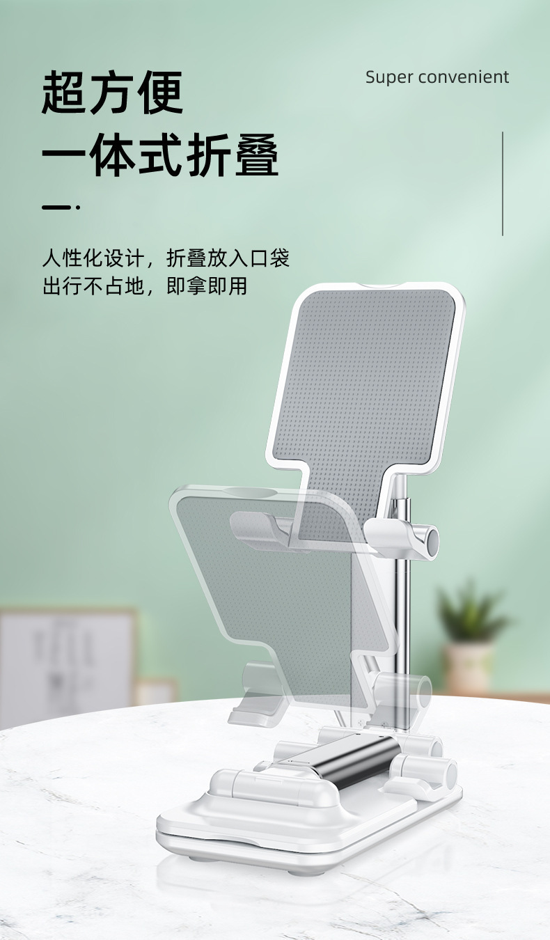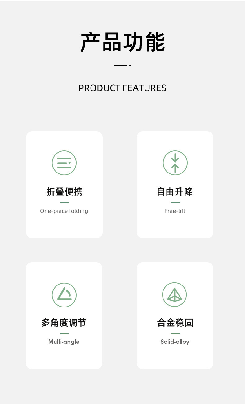 产品特色:双折叠升降,任意角度调节、可完全收纳携带方便,支持ipad摆放,稳固不倒!