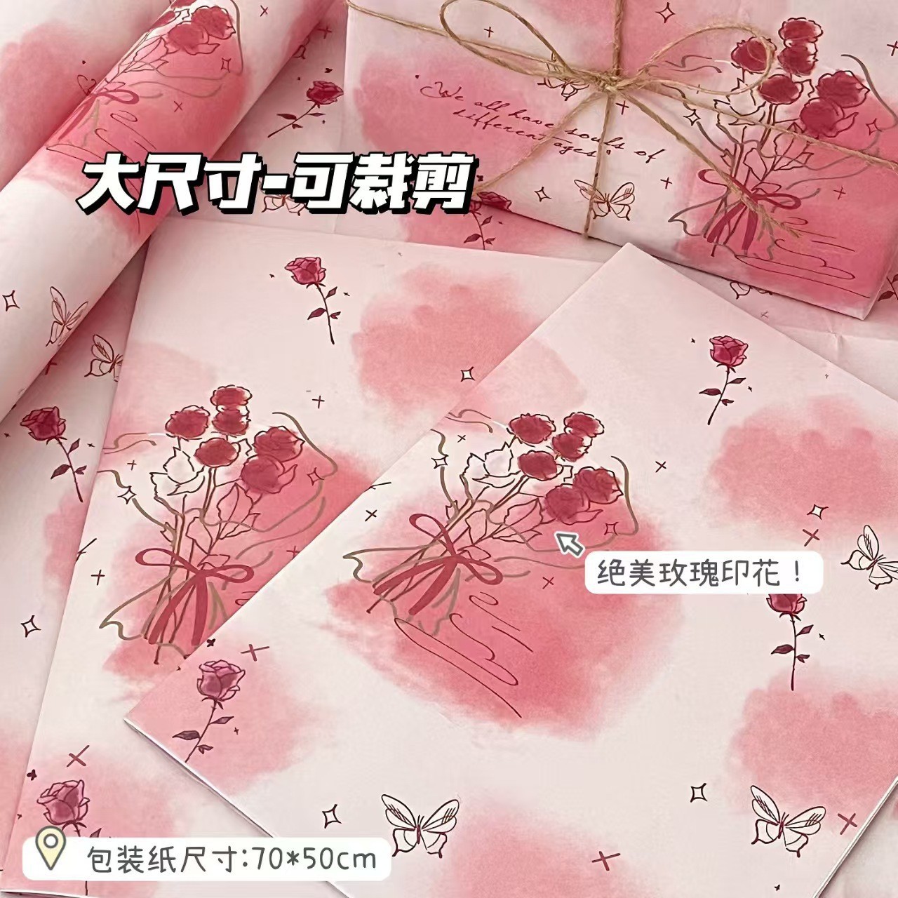 pink roses bouquet wrapping paper; each pack has 6 folded wrapping paper 50 * 70cm