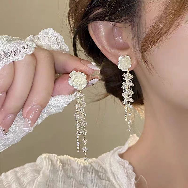 white camellia tassel ear studs