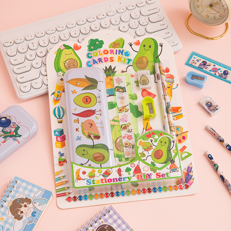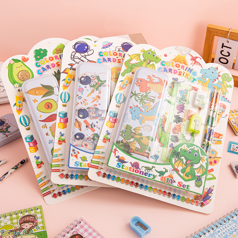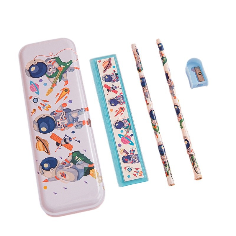 The product consists of: 1 iron pencil box, 2 pencils, 1 15cm ruler, 1 eraser, and 1 pencil sharpener.