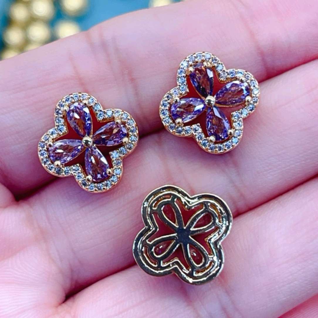 A few four-leaf clover jewelry, as if stepping into a dreamy and colorful journey. The exquisite golden frame outlines an elegant contour, resembling the border of a lucky door. The central amethyst diamond, like the stars in the mysterious night sky, emits a deep and enchanting glow, while the surrounding cluster of diamonds resembles scattered moonlight, adding a touch of brilliance. They are the incarnation of luck and beauty, quietly waiting, to open a shining journey for the wearer.