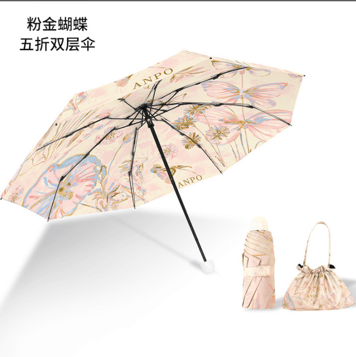 five-fold double-layer eight-bone black rubber umbrella (free handbag)-gold powder butterfly
